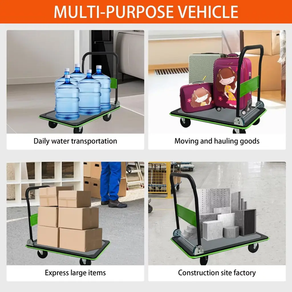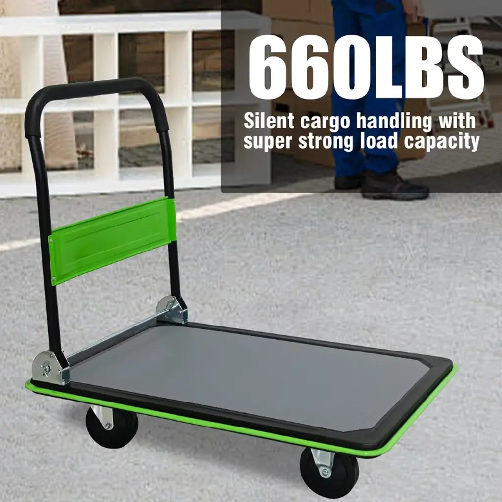 The NAYSAYE Foldable Platform Dolly is a versatile and durable flatbed cart designed for heavy duty loading and storage. Its foldable design allows compact storage while TPR silent wheels and 360 degree swivel casters provide smooth, quiet movement across any surface. The rubber wrapped handle ensures comfort during transport and the anti slip plate keeps cargo secure. Ideal for home, warehouse, travel, or utility use, this dolly handles up to 660 pounds effortlessly.