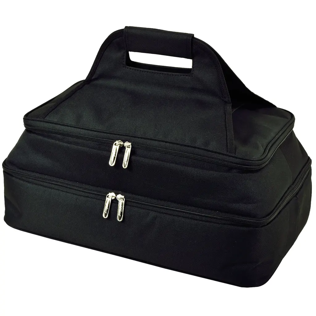 Two layer food carrier with sturdy construction and thermal shield insulation keeps food and drinks hot or cold during transport. Lower section fits up to a 5 quart casserole dish, top section is large enough for 3 wine bottles, 6 12 ounce cans, etc. Has a foil lining, and a long pocket on top to easily carry your serving utensils. Dimensions - 18" W x 11" D x 6.5" H Attractive high quality two level insulated casserole dish carrier to keep food hot or cold - great for picnics- tailgating - potlucks - and when visiting friends Great to carry casseroles cakes rolls etc., will fit a 11" x 15" - 5 qt size casserole dish in bottom section - top section can fit 3 bottles of wine or 9 cans of soda Constructed with a rugged 600 denier polyester canvas with high density insulation to prevent heat transfer Sturdy centered handle to avoids tipping Makes a great gift - designed by Picnic At Ascot in the USA - Lifetime Warranty 600D Polycanvas Spot Clean and Air Dry Imported