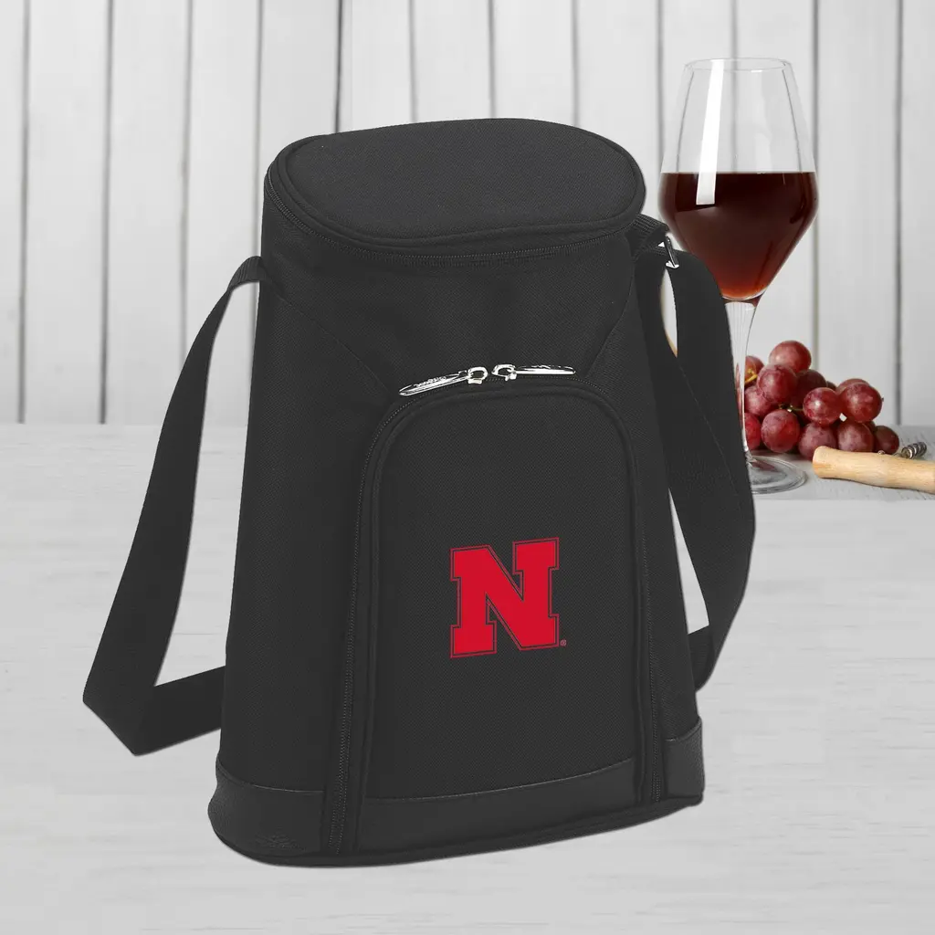 Ncaa Nebraska University Cornhuskers Stylish 2 Bottle Insulated Wine Tote Bag With Cheese Board, Knife And Corkscrew - Black