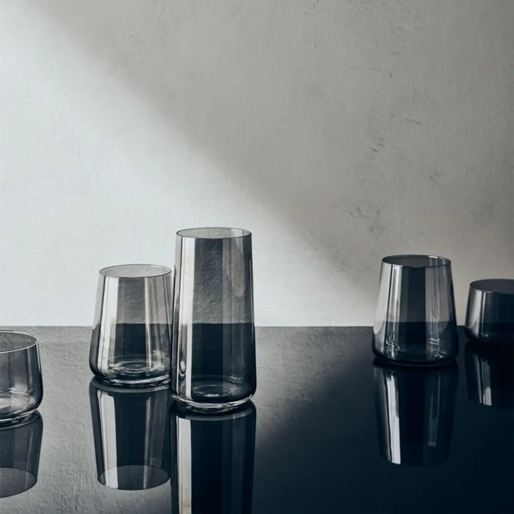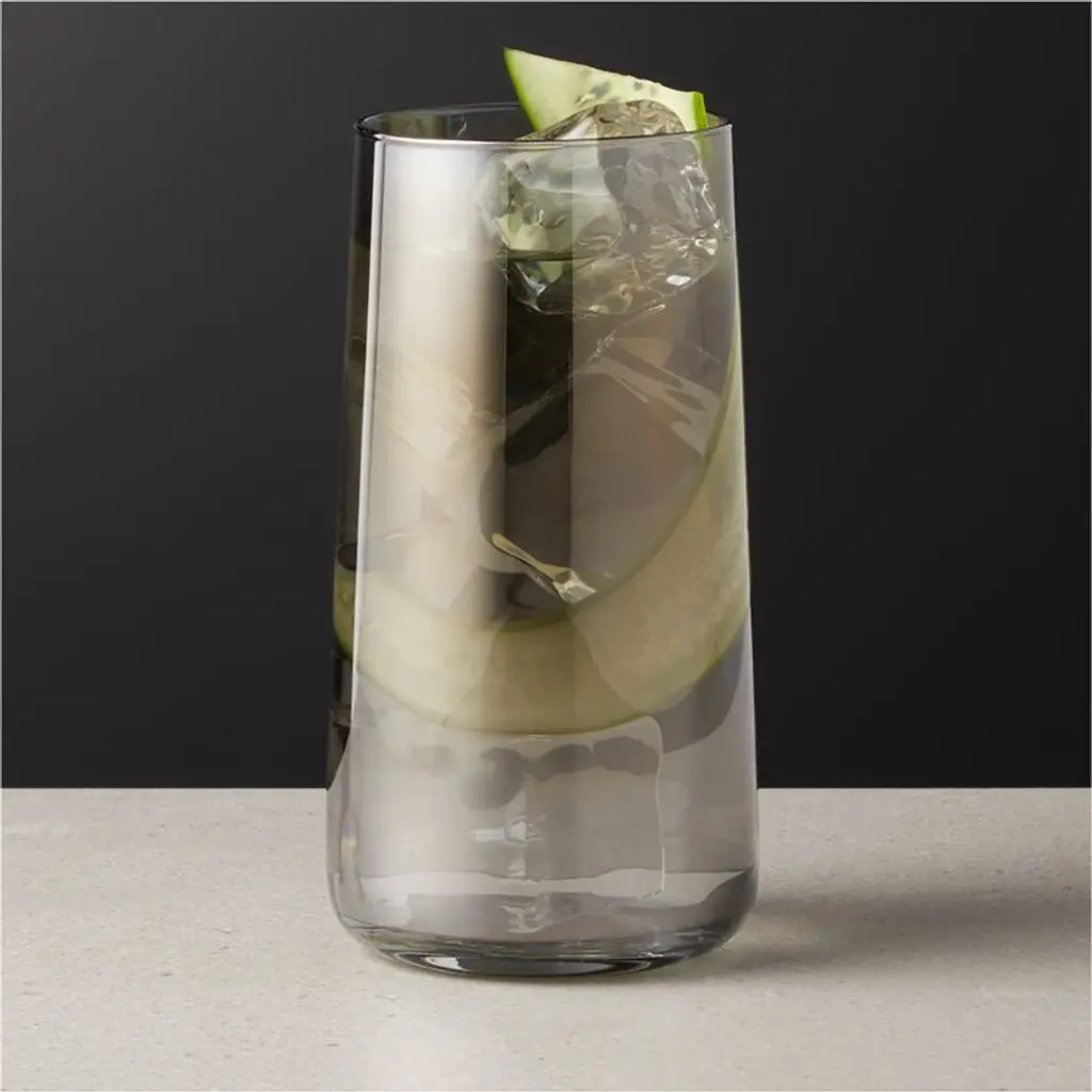 Everyday cooler with a smokey grey luster finish holds sips with cool simplicity. Round, micro-thin glass features subtly tapered sham. Pairs with the Neat Smoke Tasting Glass and Double Old Fashioned Glass. Priced right for multiples. CB2 exclusive.