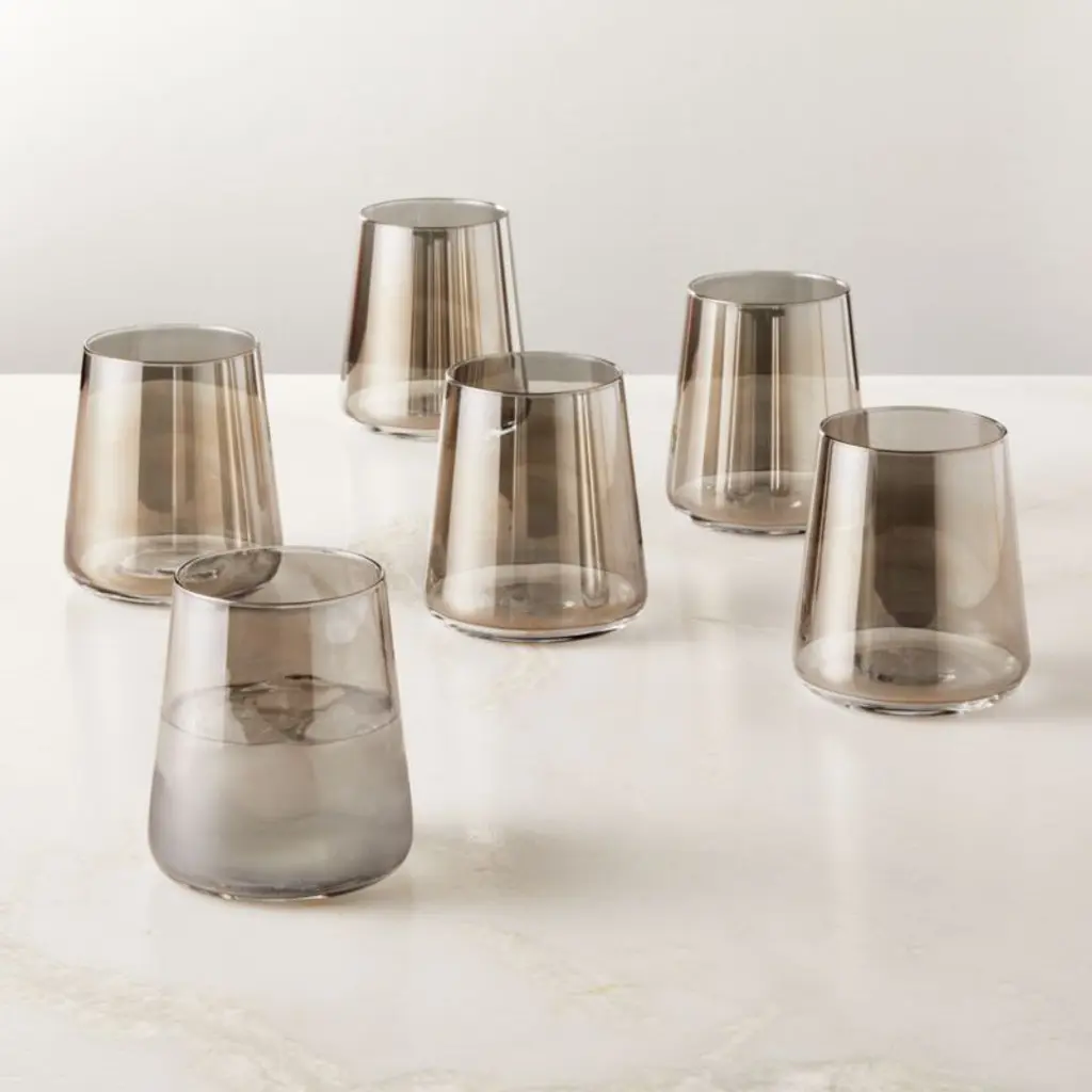 Everyday cooler with a smokey grey luster finish holds sips with cool simplicity. Round, micro-thin glass features subtly tapered sham. Pairs with the Neat Smoke Tasting Glass and Double Old Fashioned Glass. Priced right for multiples. CB2 exclusive.