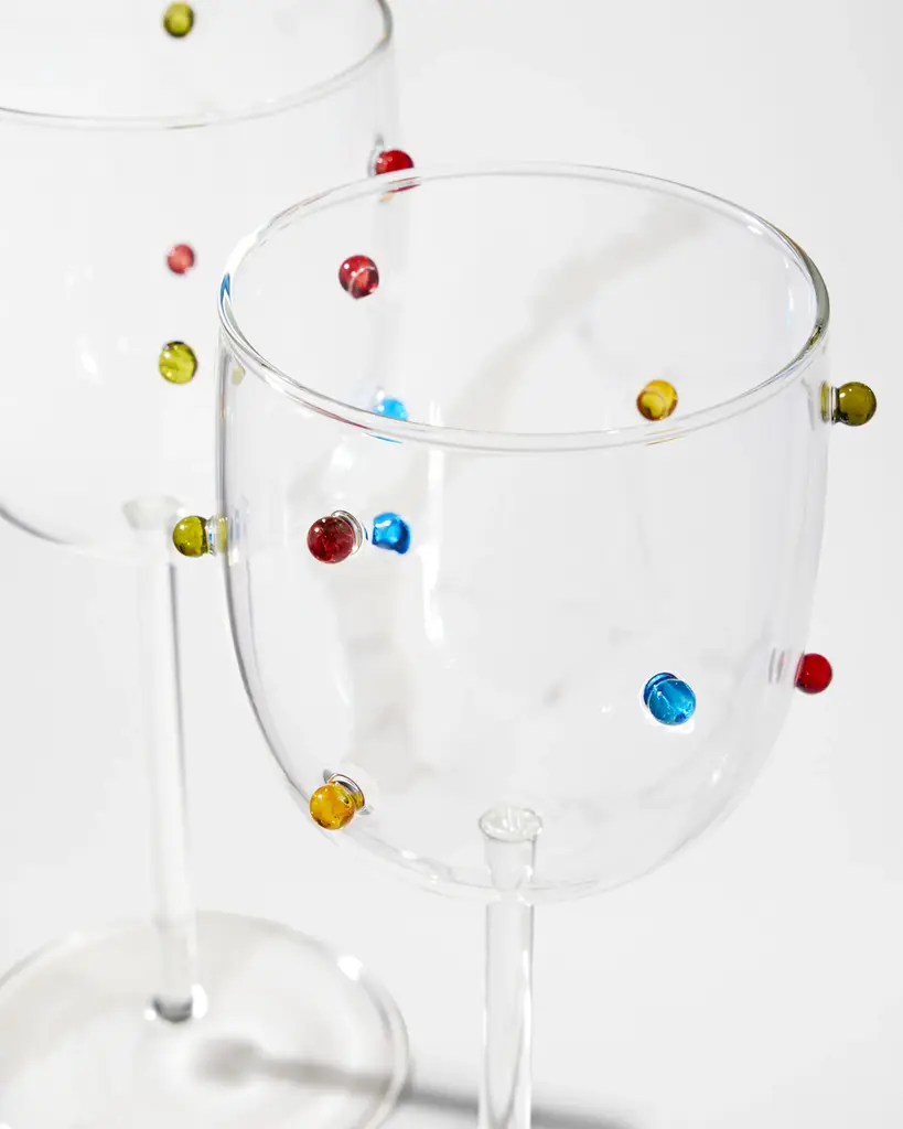 Brighten up your tablescape with this set of wine glasses, beautifully accented with colorful beads of glass fused to the exterior. Crafted of glass Approx. 3.25"Dia. x 8.3"T Capacity, 16.8 oz. each Item Weight (Lbs.): 1.0 Hand wash Set of two Imported undefined