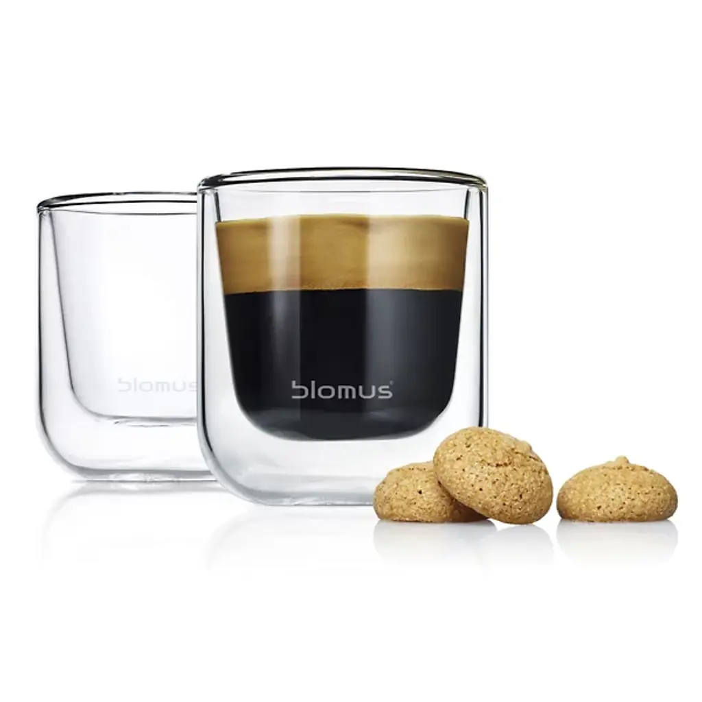 The Blomus NERO Set of 2 Insulated Espresso Tea Glasses are made out of clear hand blown glass, with a special double wall design that is both visually appealing and temperature insulating. The 2 petite glasses can be used for beverages and even food both hot and cold.