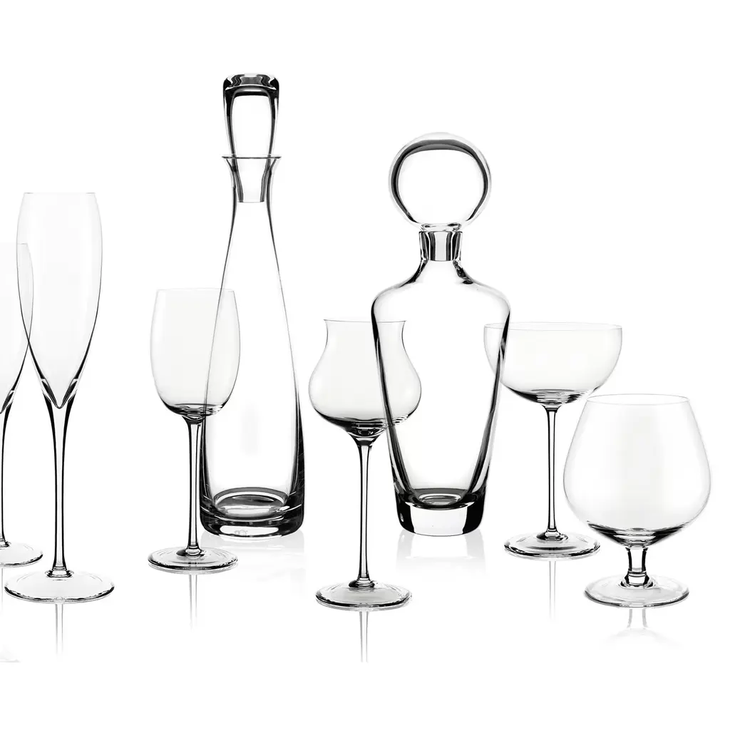 This exquisite set of two bottles with stoppers is a versatile and refined addition to any elegant home. Either used to serve wine or liquors at the table, or to store them in a bar cabinet, this set will add a sophisticated accent on any occasion. The bottles are crafted of transparent glass with elongated, harmonious volumes. The Ambrosia bottle is 40 cm high with a capacity of 92 cl, the Spirit Drops bottle is 31.5 cm high with a capacity of 85 cl.