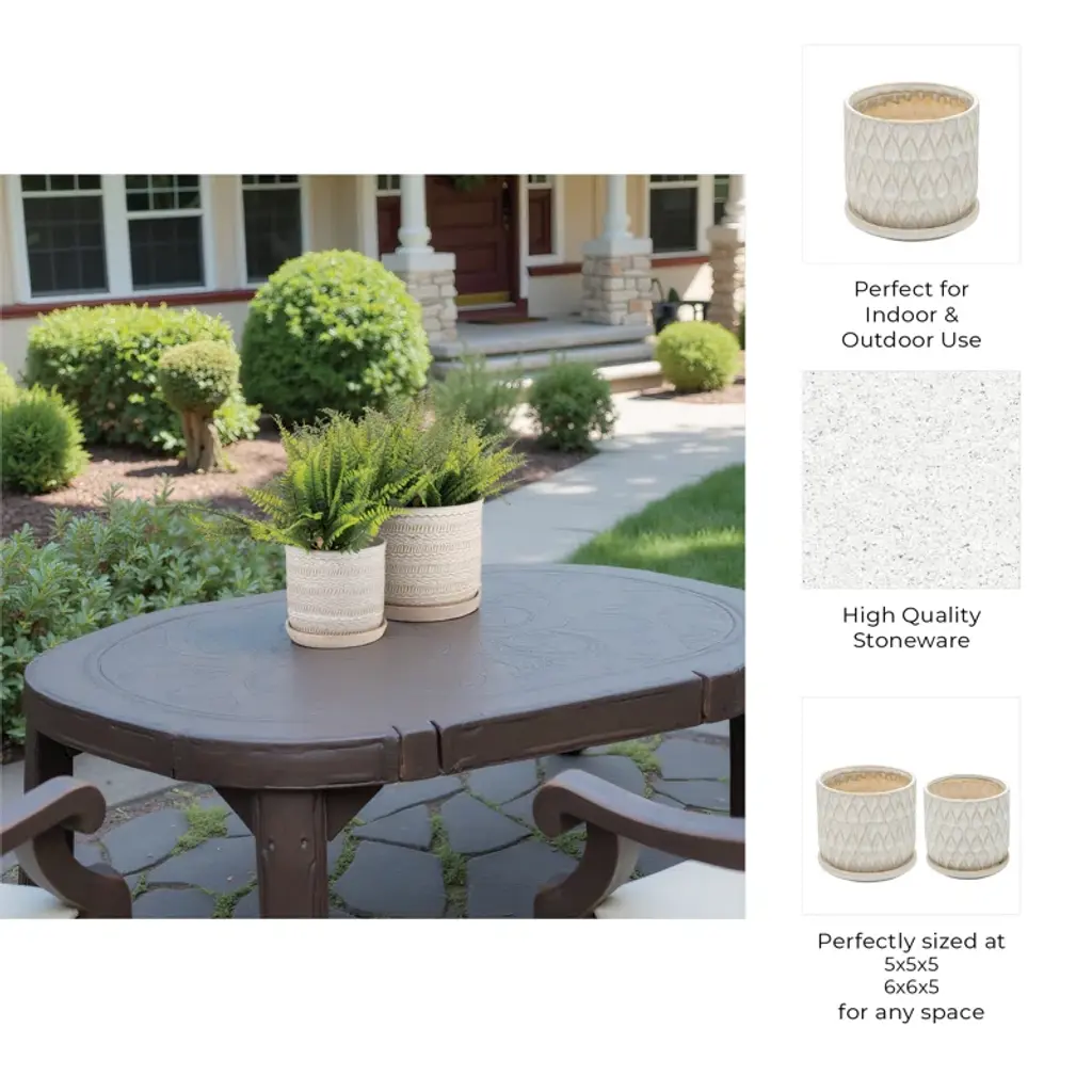 Enhance your indoor and outdoor greenery with this set of two saucer planters, expertly crafted from durable stoneware and ceramic for lasting beauty. Designed to complement a variety of home decor styles, these planters offer both elegance and functionality. The included saucers help prevent water spills, keeping your surfaces clean while ensuring proper drainage for healthy plant growth. Perfect for succulents, flowers, or herbs, these versatile planters add a sophisticated touch to any space, whether displayed on a tabletop, shelf, or patio. Their sturdy construction makes them ideal for both indoor and outdoor use, offering excellent resistance to wear over time. Whether creating a cozy indoor garden or upgrading your outdoor decor, this planter set provides a stylish and practical solution. Bring a natural, decorative element into your home and garden with these elegant stoneware planters. Order now to elevate your plant display with timeless charm.