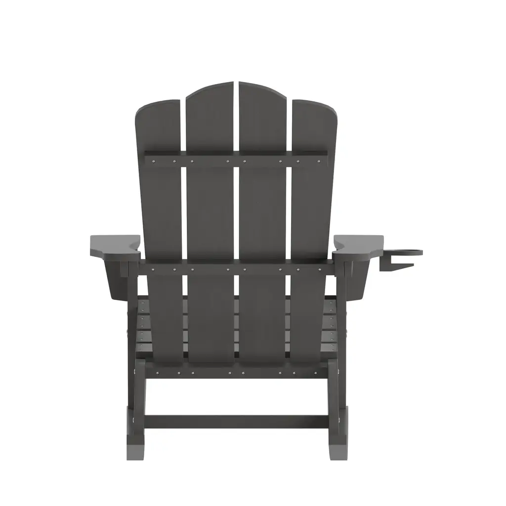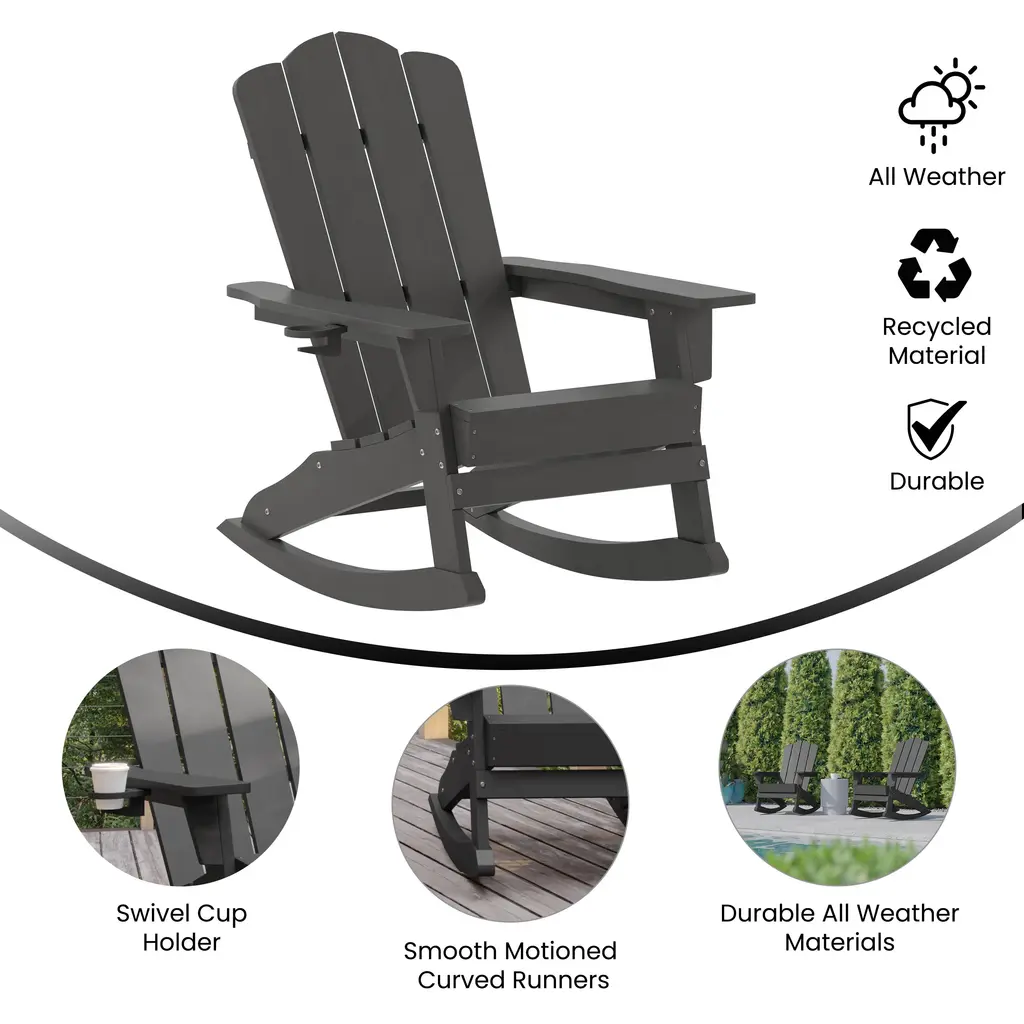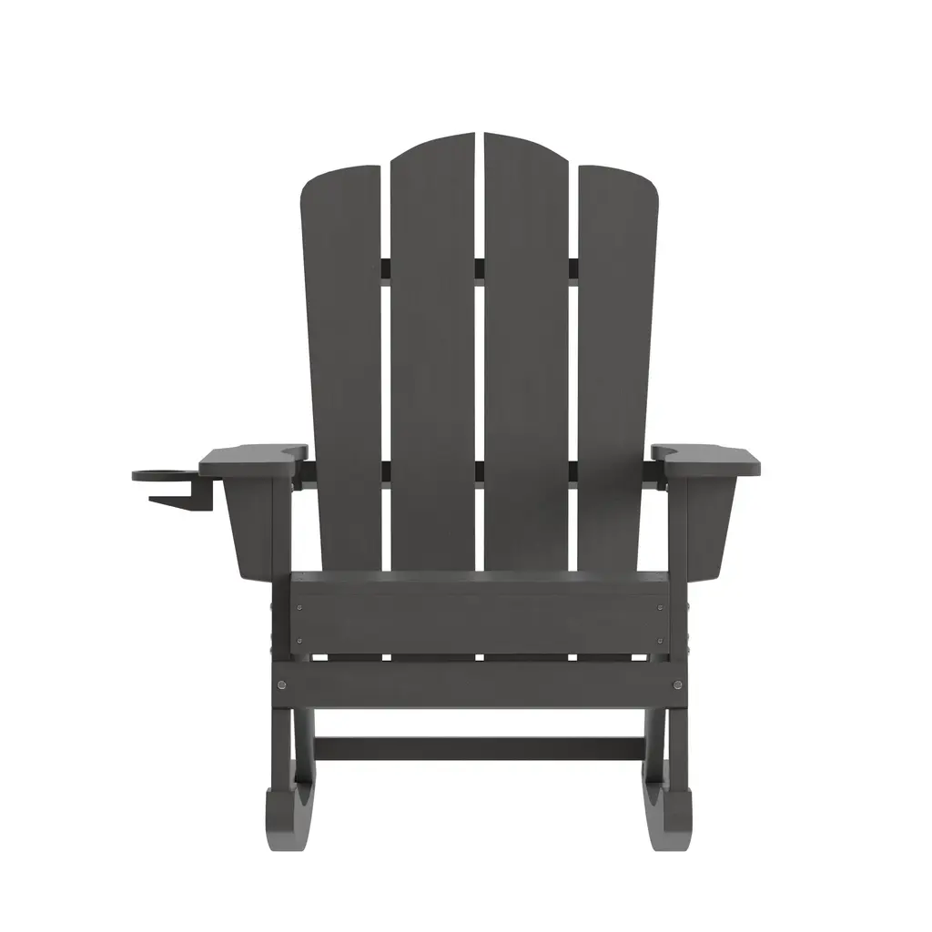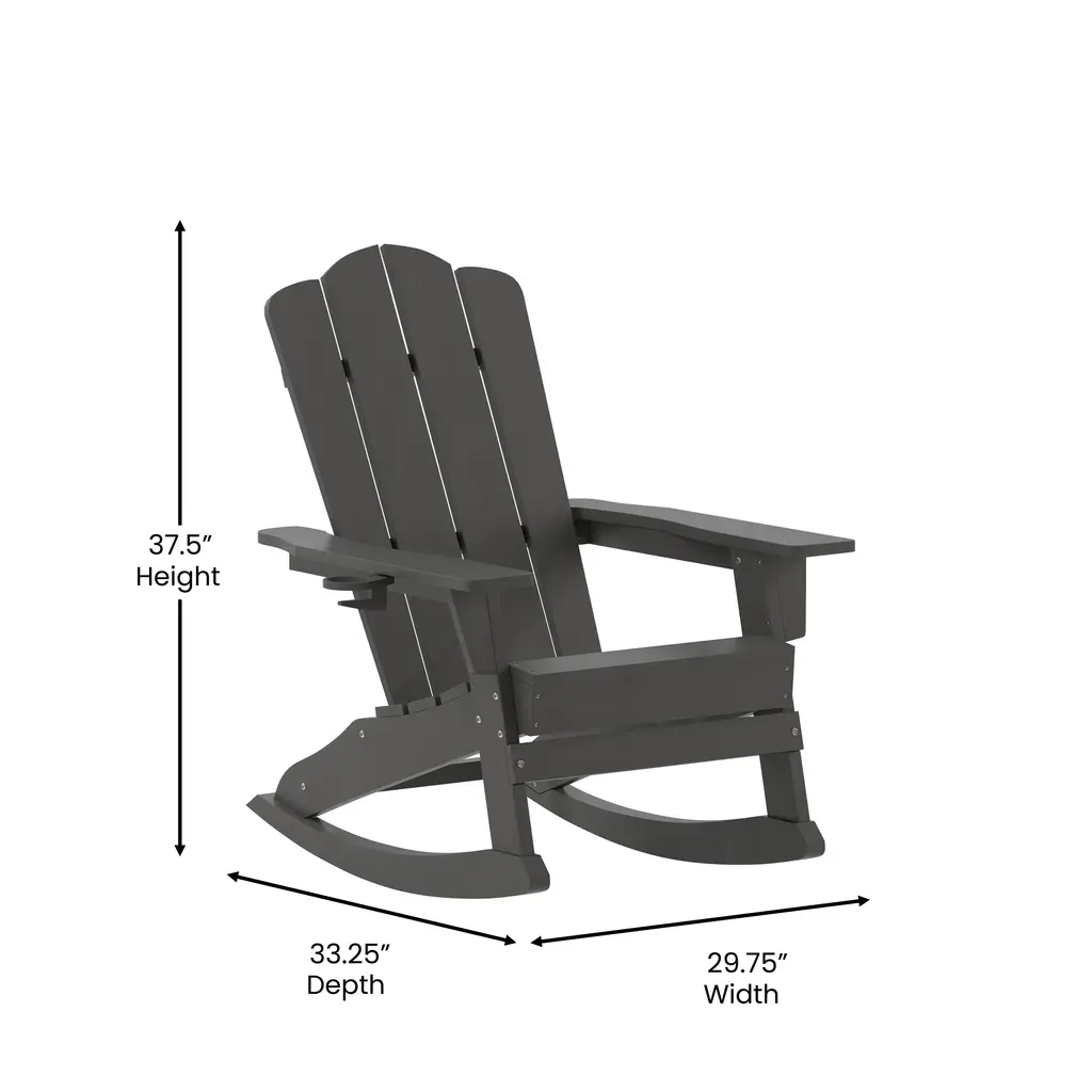 Provide the perfect place for patrons and guests or friends and family to relax and unwind at your home or business in total comfort with this all-weather adirondack style rocking chair. No matter your decorating style, the vertical slat back and sloped seat design add a new twist to a classic favorite that fits in anywhere. The extra wide arms will help relieve tension from the neck and shoulders while the sloping runners provide smooth rocking motion for cozy relaxation. This indoor/outdoor rocking chair is made of long-lasting HDPE so there is no warping, rotting or chipping and no back breaking sanding and staining necessary to keep this chair looking great. Stronger than wood, this outdoor rocking chair will hold up to 300 pounds static weight capacity and ensure you have a comfortable, worry free seating experience. This porch rocking chair is weather and rust resistant to stand up to all elements from blistering summers to snowy winters and everything in between. Assembly is quick and easy and the tools are included so you can make use of your new rocker chair in 30 minutes or less. Take care of pesky dirt or spills with a damp cloth. Buy a pair of these rocking chairs to form a cozy conversation area or pair several with one of our outdoor patio heaters for the complete year-round setup.
