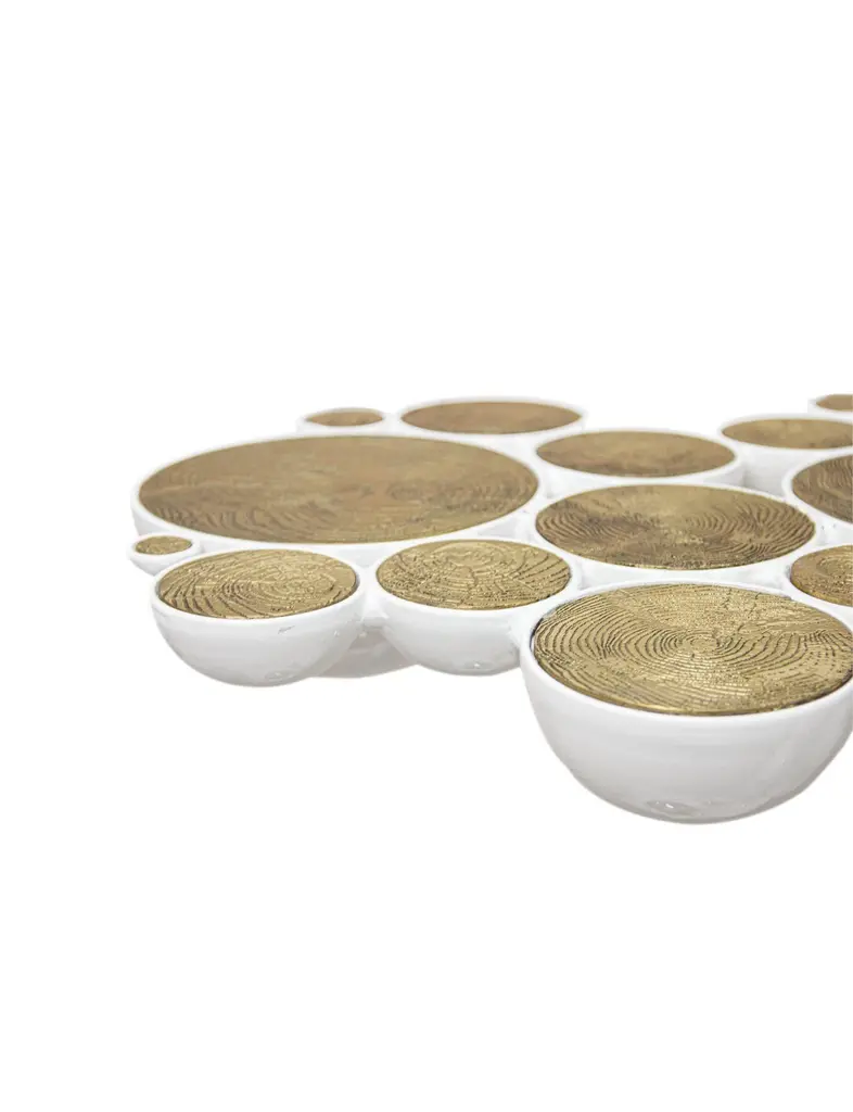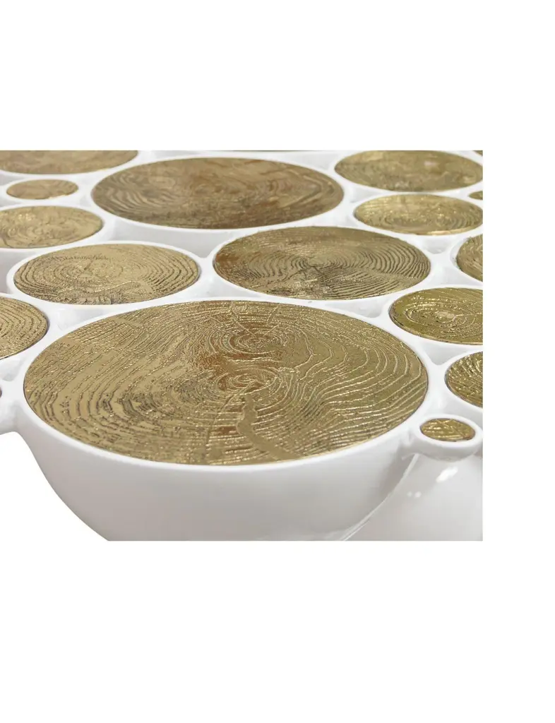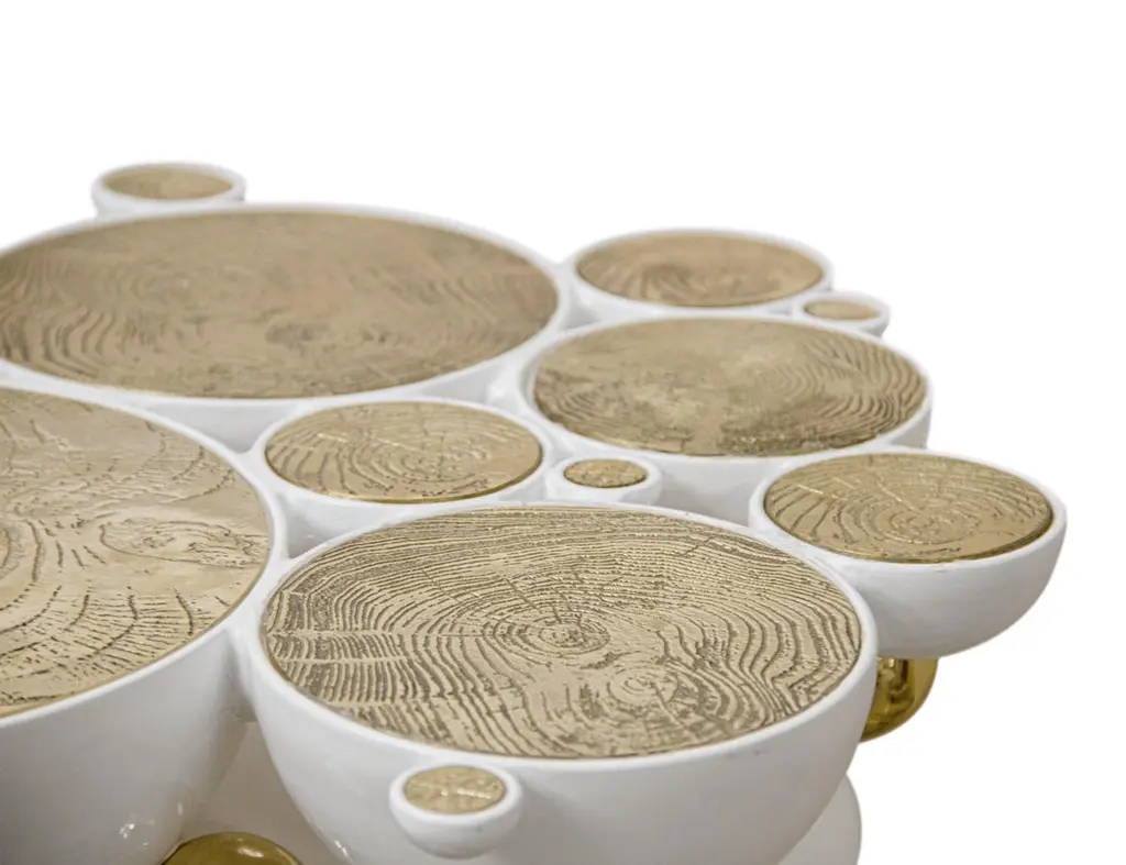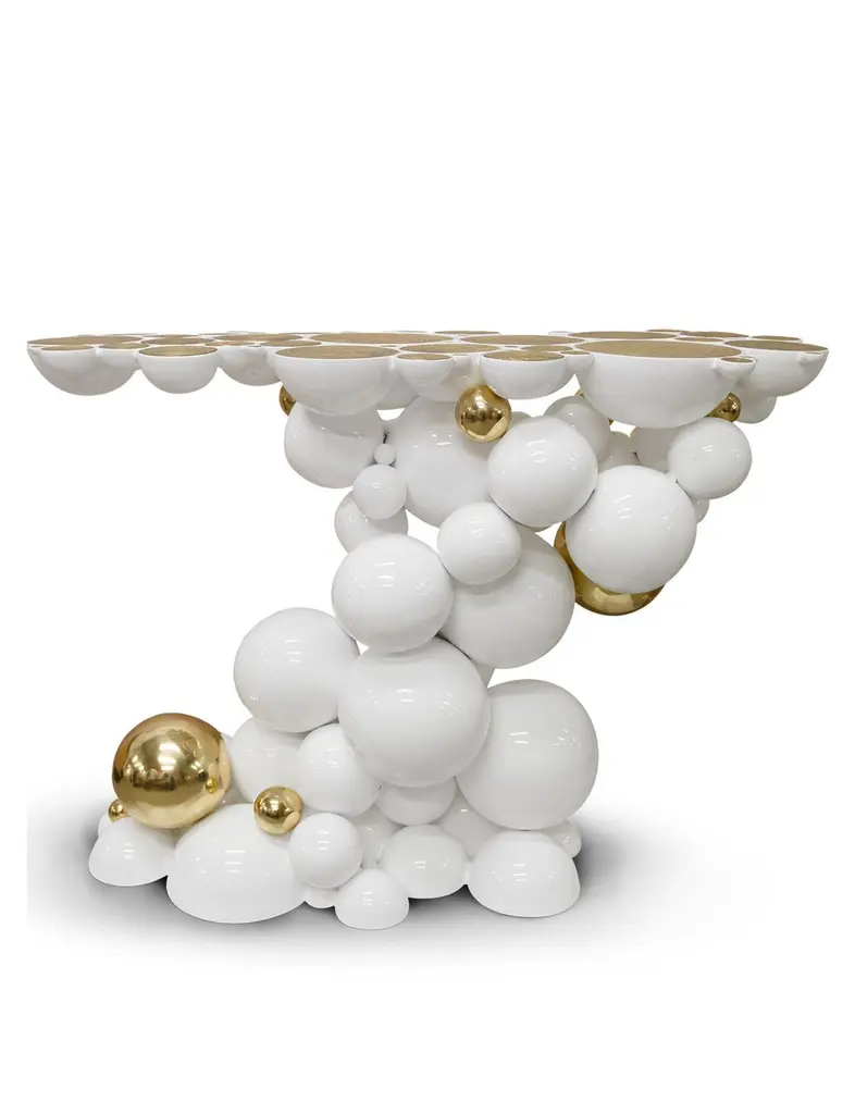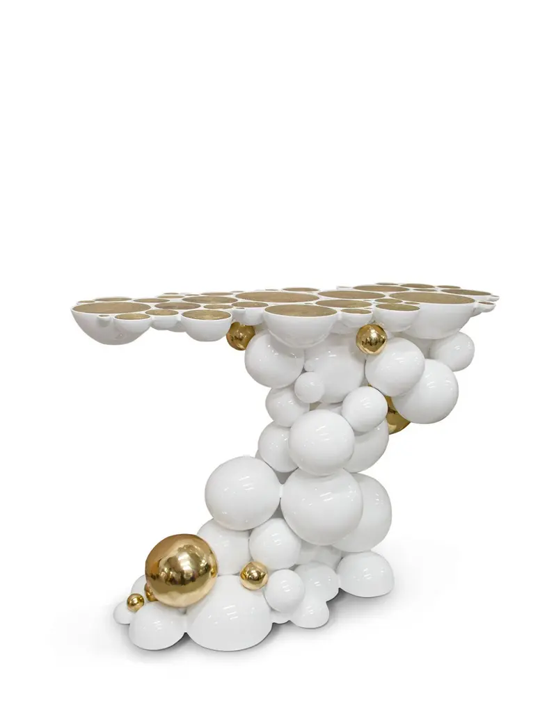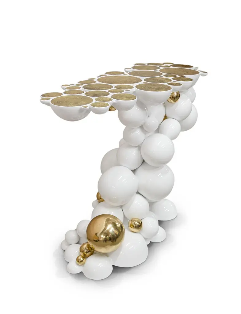 Defying the laws of physics, the Newton white and gold console has grown from the ancient art of casting metal, where metal is heated until molten into spheres and semi-spheres shape. One by one, each element is joint to produce an outstanding pattern and organic structure, finished in a dramatic white lacquer and gold plated accents. The top of this console table is composed of brass circles carved with a golden texture similar to organic wood texture. A contemporary console that carries cultural legacy while successfully moves towards the future, remaining ahead of the of the design scene. A real expression of exclusivity and high collectible craftsmanship outcome.