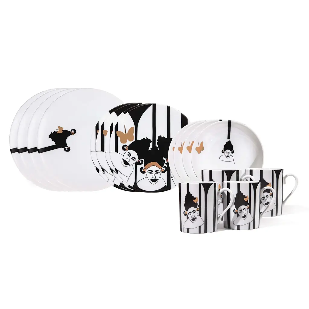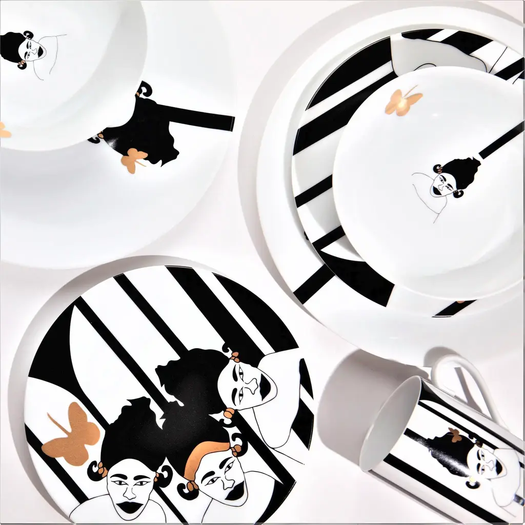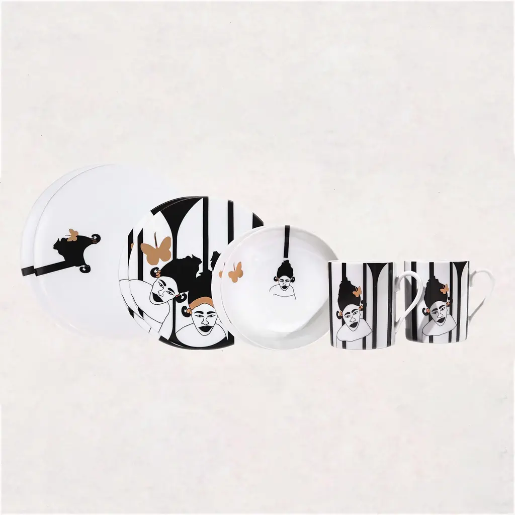 The Nguka Luxury Dinnerware Sets - Plate, Salad Plate, Bowl, Mug is an artistic tribute to traditional Senegalese women and women’s portraiture. The pattern of the luxury dinnerware is inspired by African heritage. The fancy plate design creates a lovely balance with modern decor and functional form. Select a designer dinnerware set of 8 to accommodate service for two with 2 dinner plates, 2 salad plates, 2 bowls and 2 mugs. Or opt for a french dinnerware set of 16 with service for four including 4 dinner plates, 4 salad plates, 4 bowls and 4 mugs.