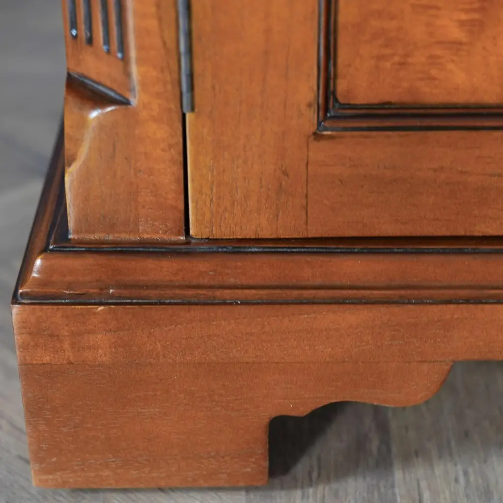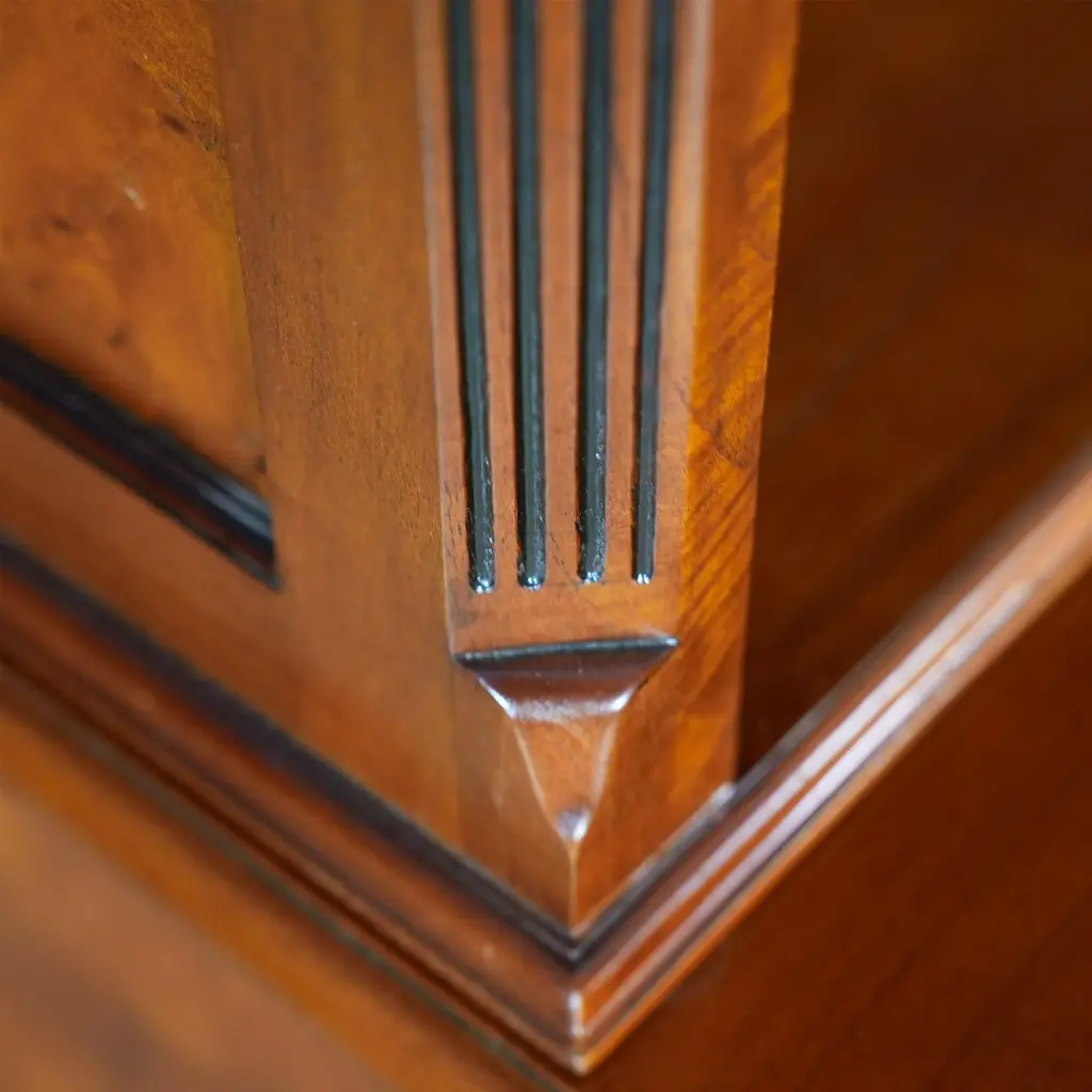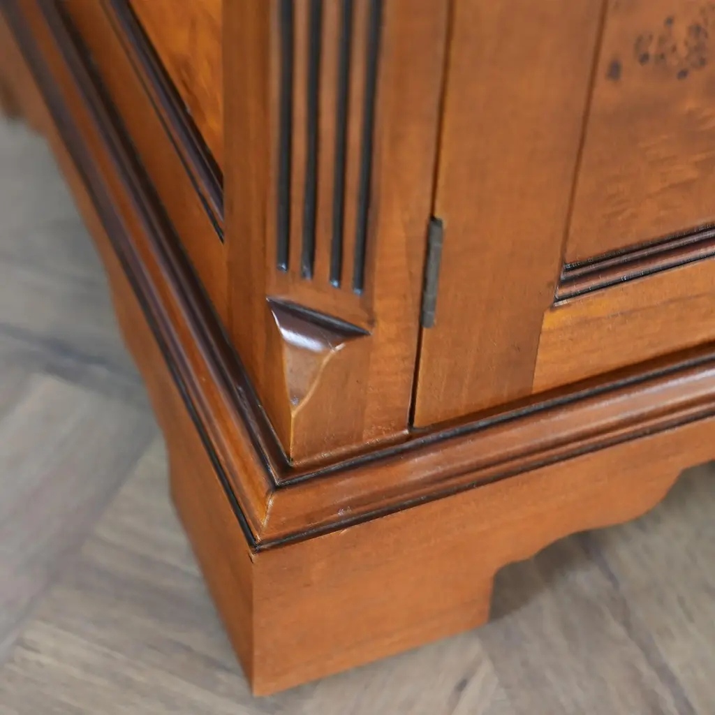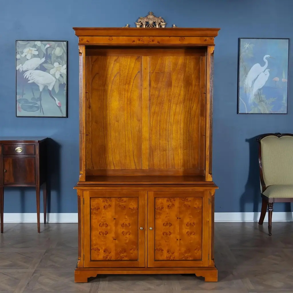 Our Country Estate Cupboard is manufactured in two sections, the upper section consisting of a deep, molded cornice with burled veneer following the shape of reeded corners rising from below, with lamb tongue detail at the top and bottom of the reeded area. The open top section allows easy viewing and easy access of the cabinet and contents without interruption. The bottom section of the Country Estate Large Cupboard features two molded cabinet doors each with a wooden shelf and with more reeded columns on the side, all resting on shaped and styled bracket feet. Ideal for use in the dining room, also at home in either an office or living room setting. Item Measures Approximately 47″w x 19″d x 83″h