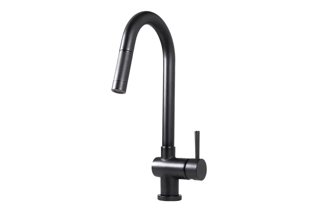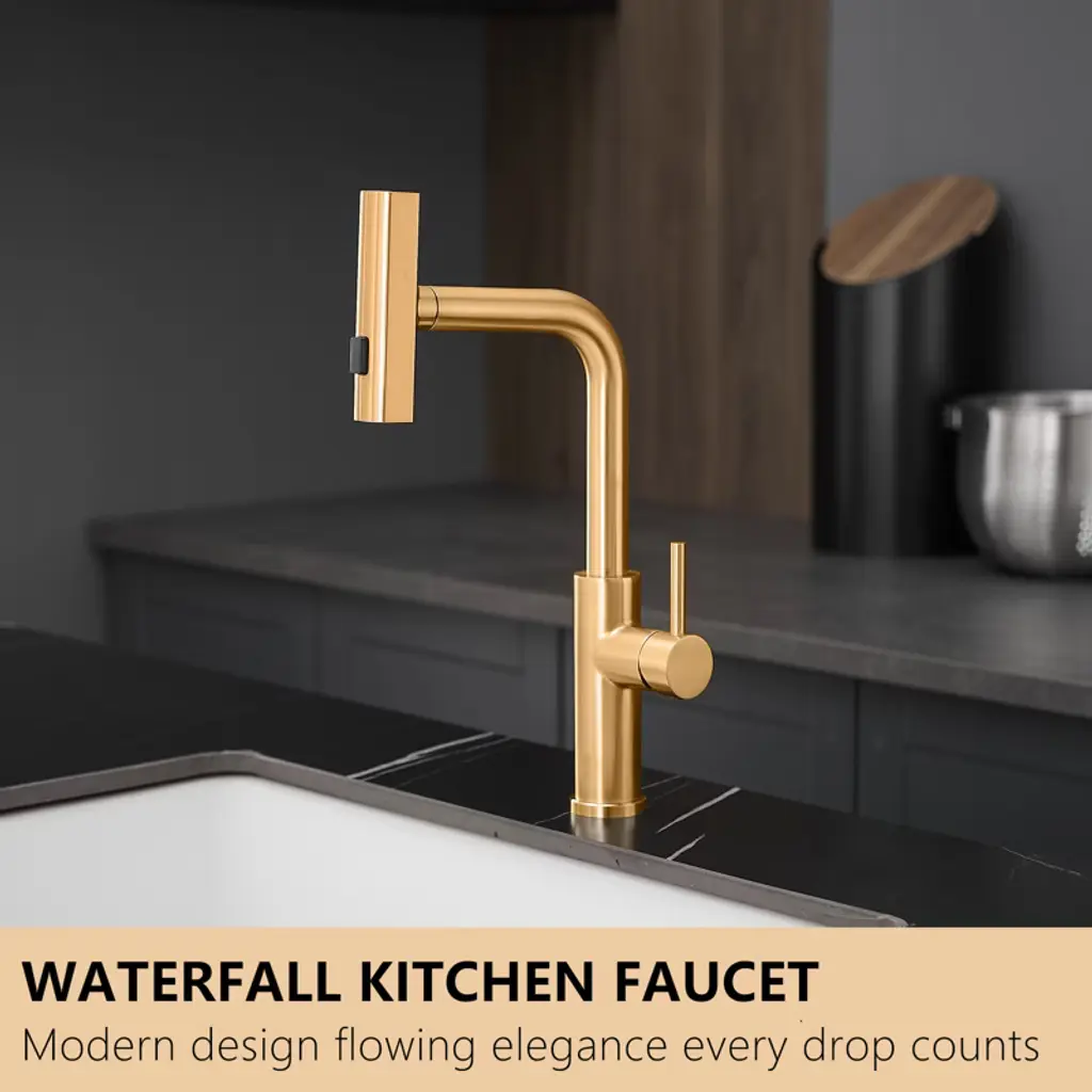 Nickel gold kitchen faucet with deck plate, pull-out sprayer, single handle, adding luxury and functionality.
