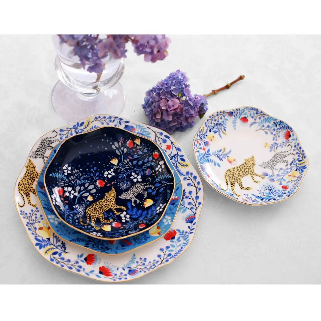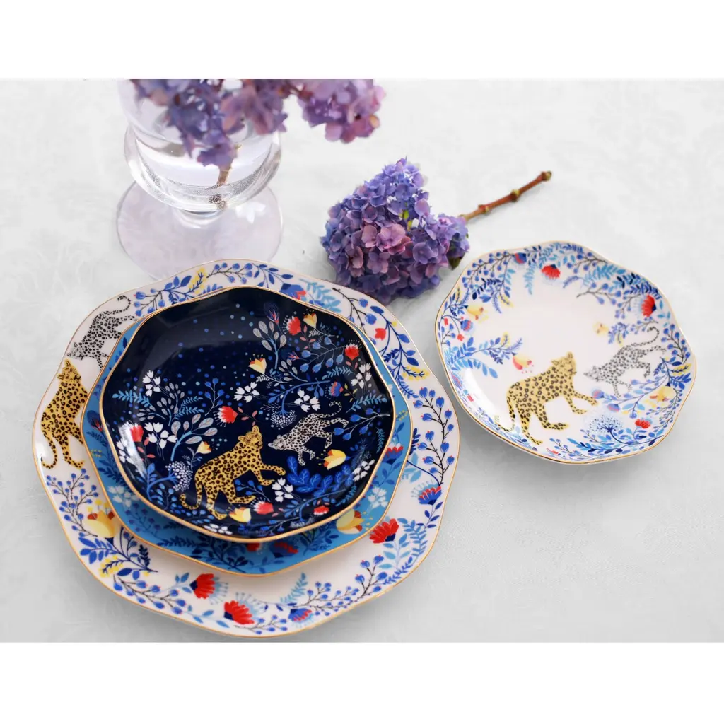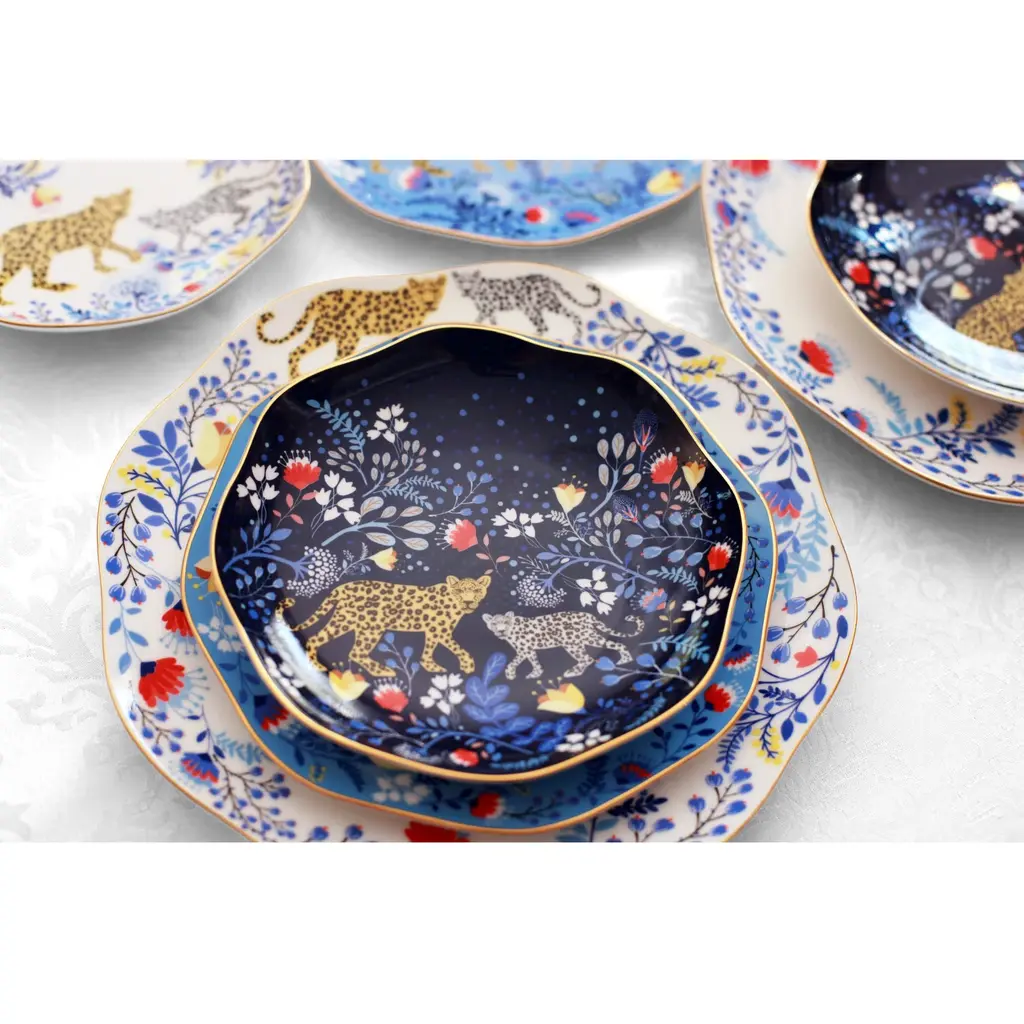 These Amazon Rain Forest Fine Bone China featured Amazon Rainforest creatures and the wonders of nature, connecting fine art and nature. Bright gold banding looks fantastic and provides superior strength. Starters, sides or sweets, true luxury is about following your intuition. Rich in colour, print and personality, this design will spark your imagination and add a pop of inspiring color and bold pattern to your table. Presented in our signature JZ gift box.