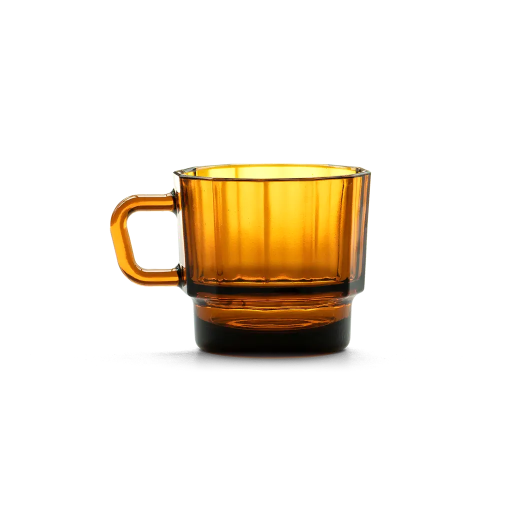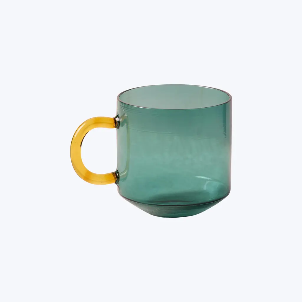 Bring vintage charm to your daily brew with the Niko Glass Mug by Be Home. Crafted in durable borosilicate glass, this elegant mug features a retro silhouette and a rich, earthy palette. Artisan-made in India. Available in amber, black, green, and teal.