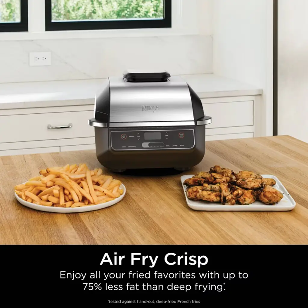 Meet the Ninja® Foodi® Grill. The grill that sears, sizzles, and air fry crisps™. With Cyclonic Grilling Technology, super hot 500°F air delivers Surround Searing, while the 500°F high-density grill grate creates char-grilled marks and flavors virtually smoke-free.