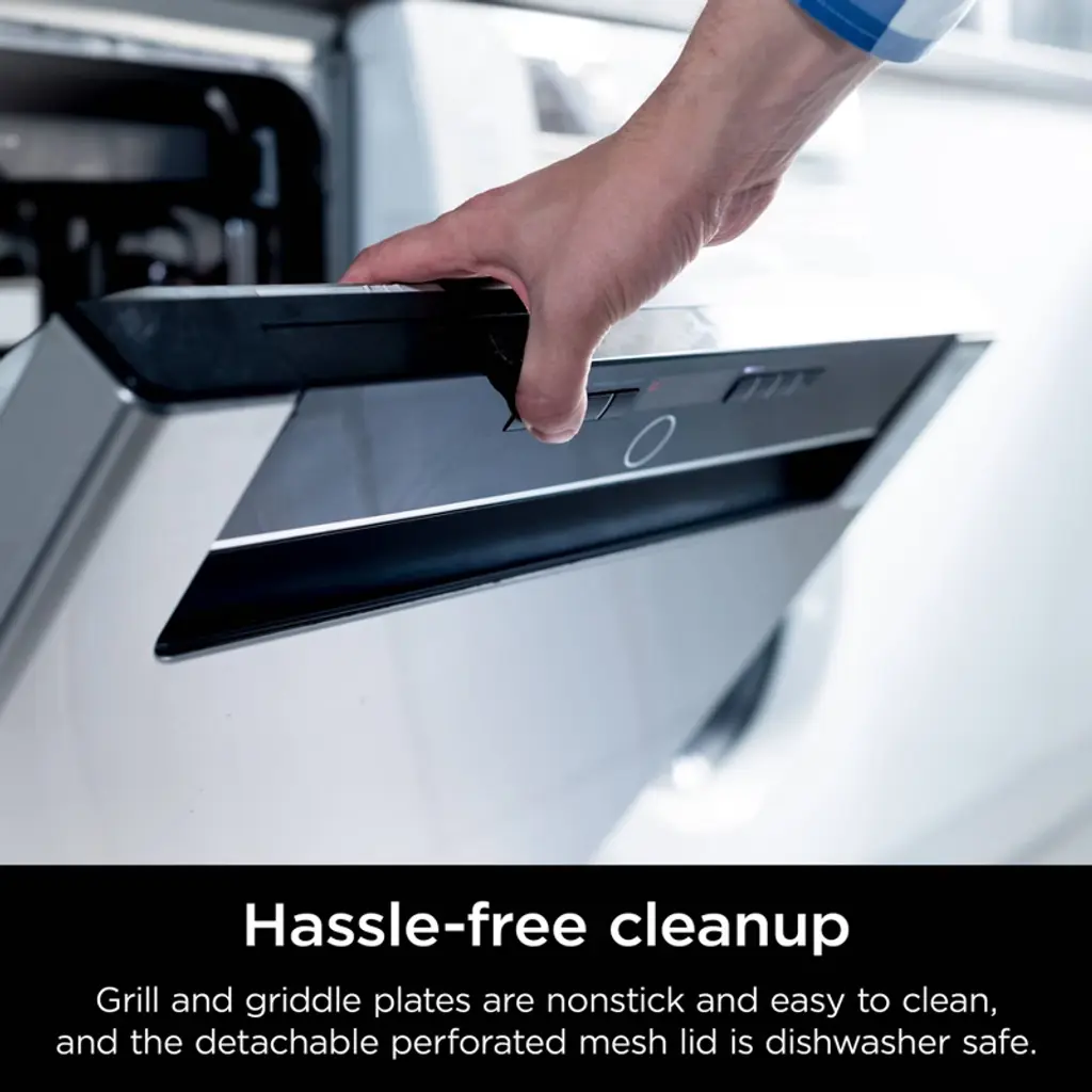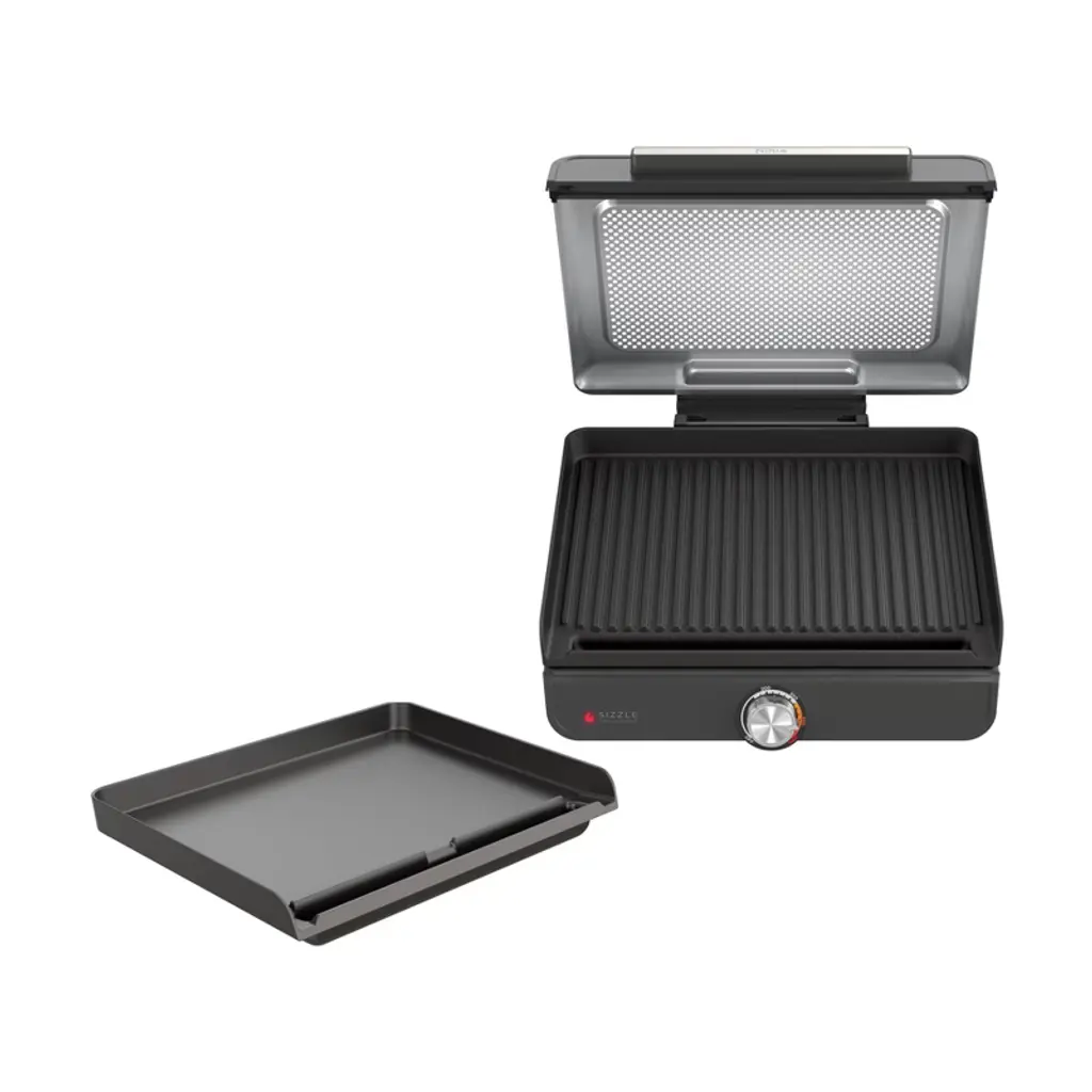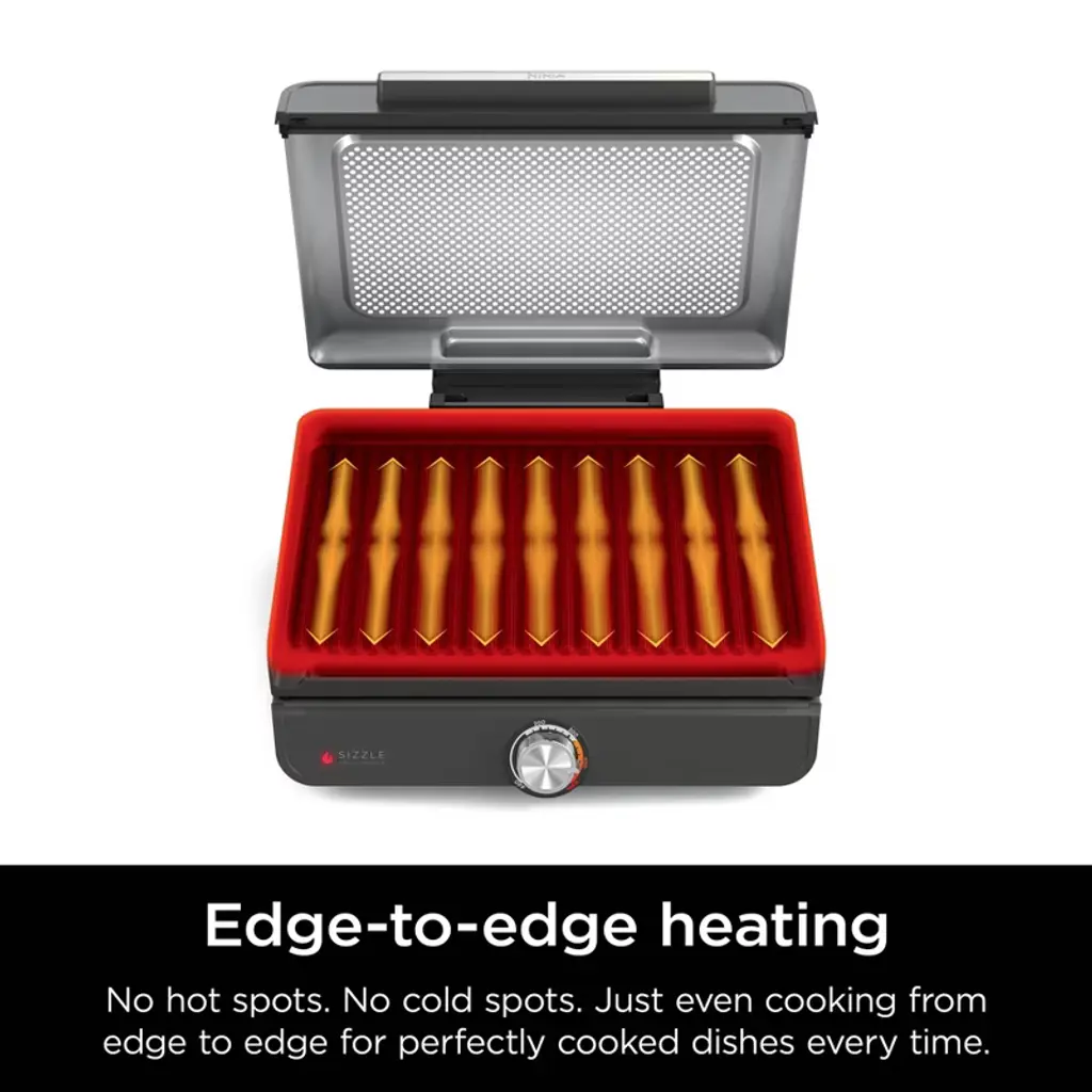 Meet the Ninja Sizzle™, the compact cooking system that high-heat grills and griddles your favorite meals right from your countertop. Reaching temps up to 500°F, achieve the perfect char-grilled marks with direct, edge-to-edge even heat.