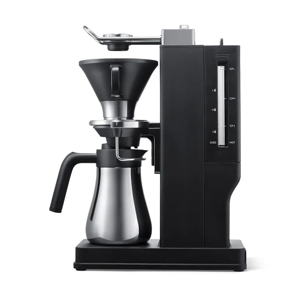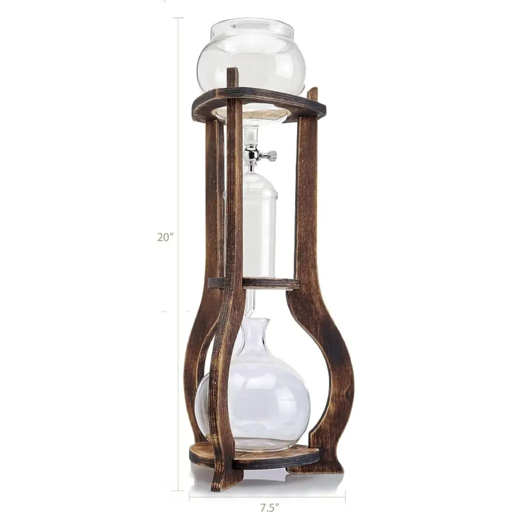 Vintage cold brew coffee maker set in wooden frame. Including glassware, filter and adjustable valve to perform dripping. Easy to assemble and clean after use. Brief instruction included. It makes slightly sweeter, a bit milder, and way less acidic than your average iced joe. Good for 6 - 8 cups of coffee. Dimension: H 20" x L 7.5" x W 7.5"