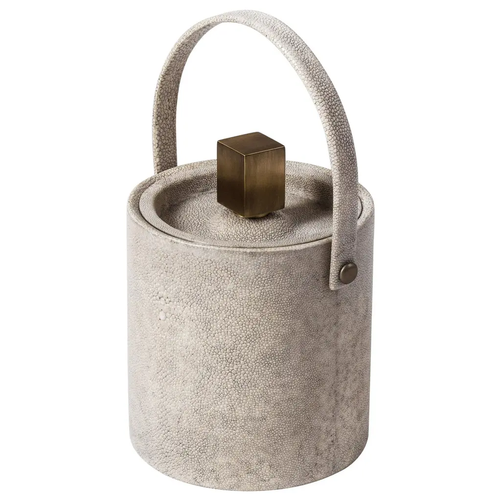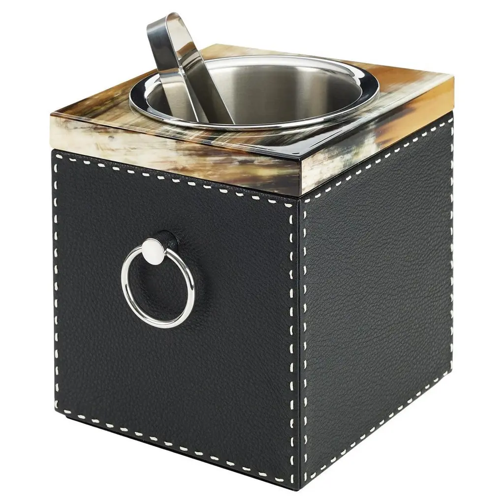 A removable steel bucket nested in a superb box of sartorial inspiration defines the design of this sophisticated ice bucket. Emphasized along its profiles by hand-sewn, contrasting stitchings, the pebbled beige Aida leather covering the sides stands in sharp yet harmonious contrast with the adjoining glossy-finished horn inlay. Stainless steel ring handles complete the design.