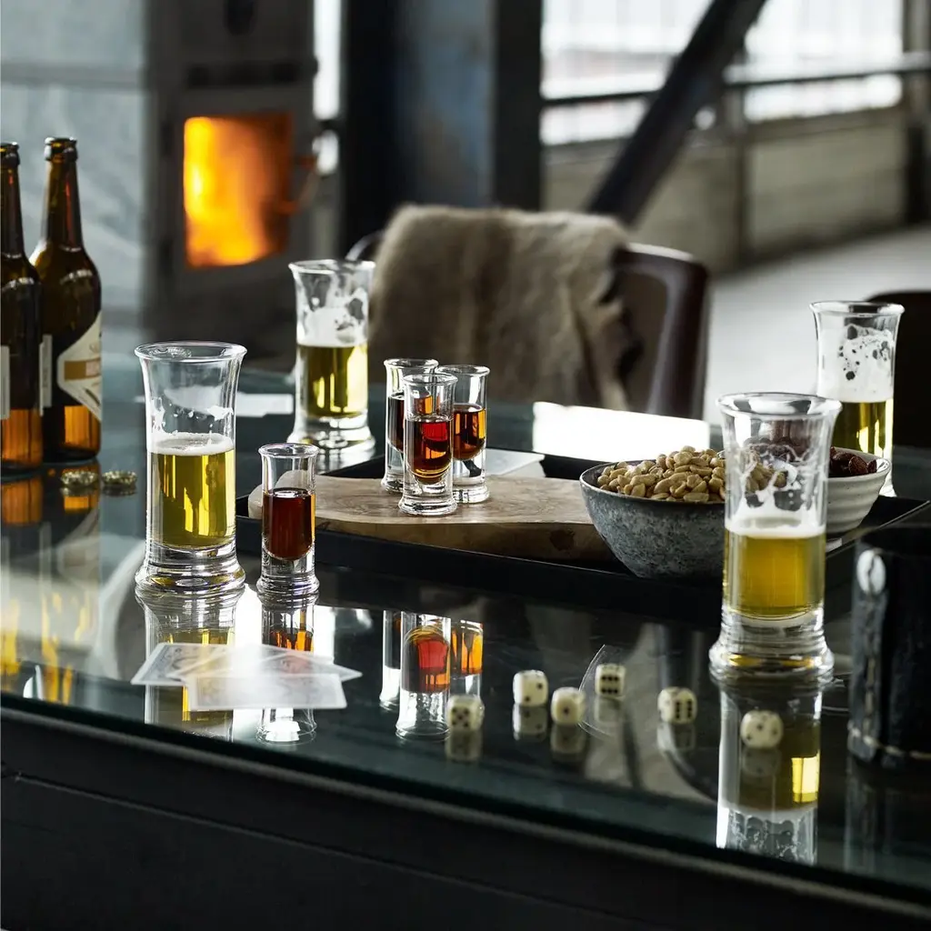 Set the table for a classic Danish lunch with mouth blown shot glasses With more than 3,000 designs to his name, Per Lutken was one of Holmegaard's most advanced glassblowers The No 5 range was launched in 1970, and its elegant design means that it is still a welcome guest on any contemporary table The shot glass has a volume of 5 cl and can be placed briefly in the freezer before serving an ice-cold, frosted aquavit The range also includes beer and long drinks glasses An ideal gift idea for a special occasion.