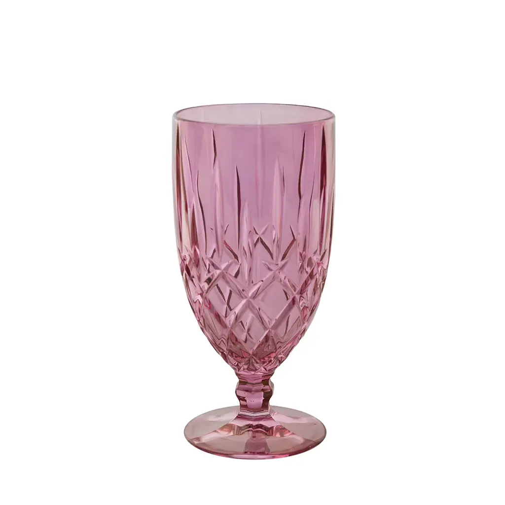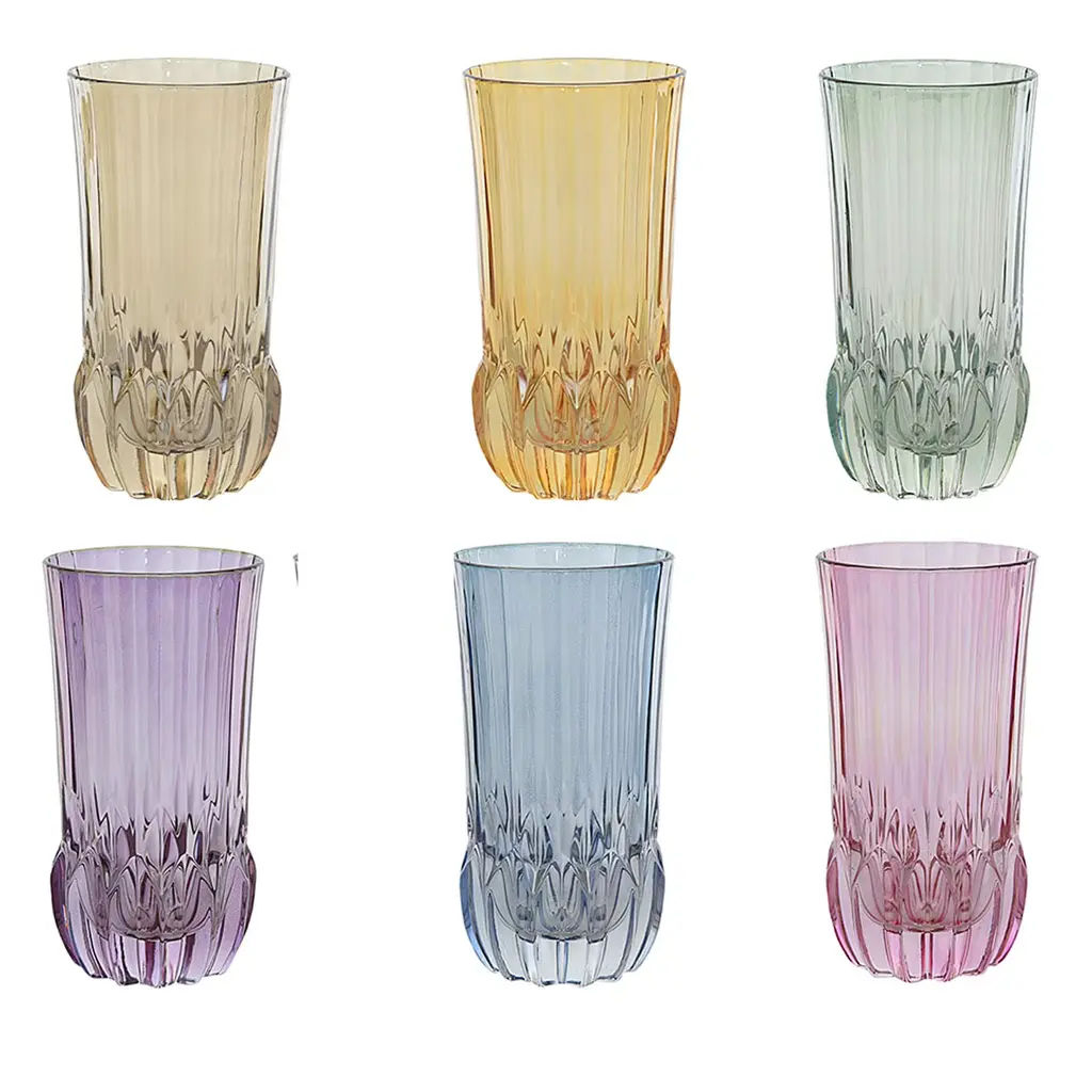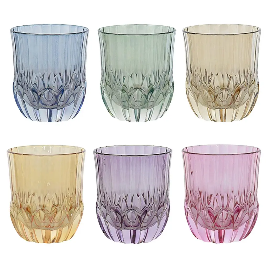 This set of six water glasses will make a charming addition to a modern decor. Marked by a round base, short stem, and capacious bowl, each glass is enriched with textural engravings and features a different hue.
