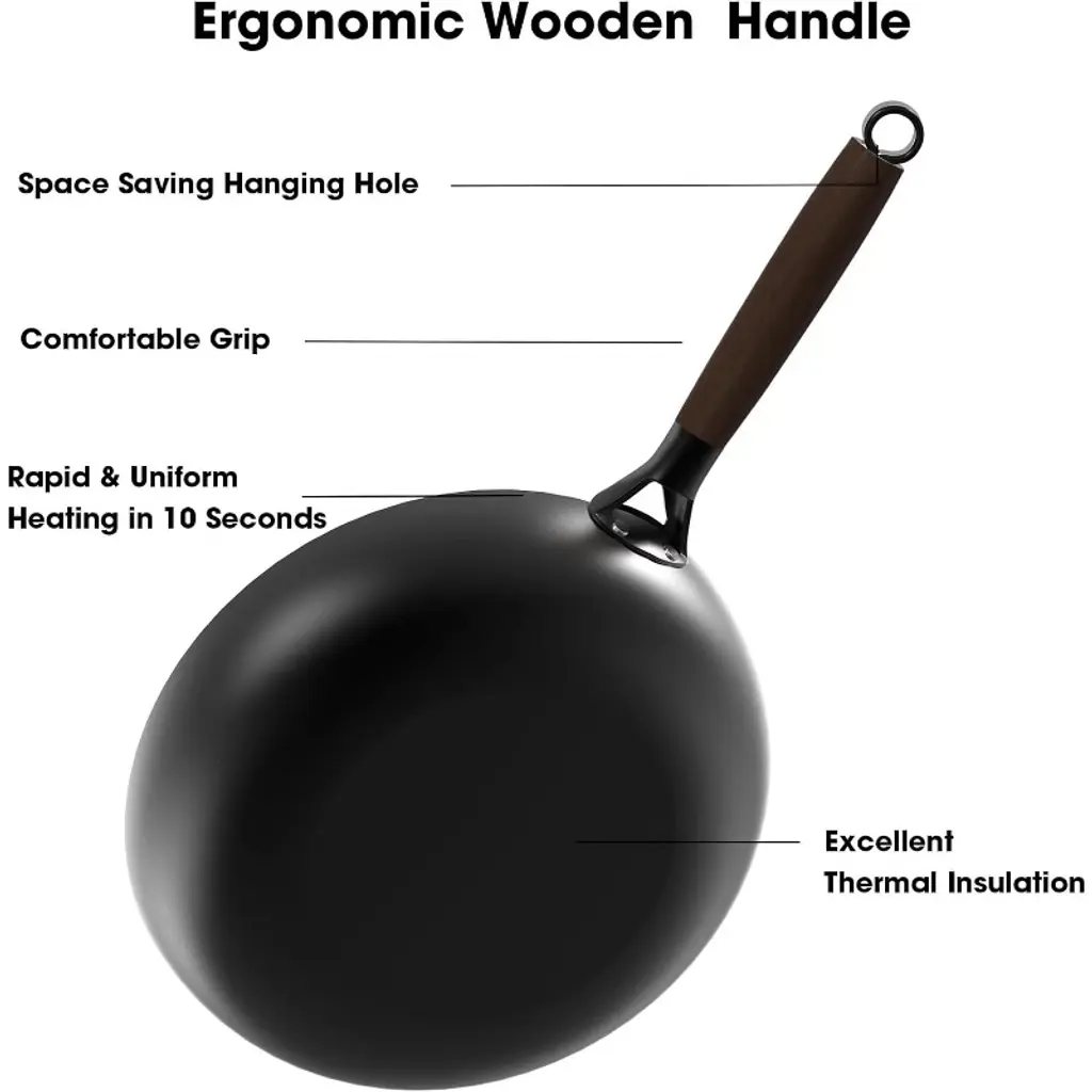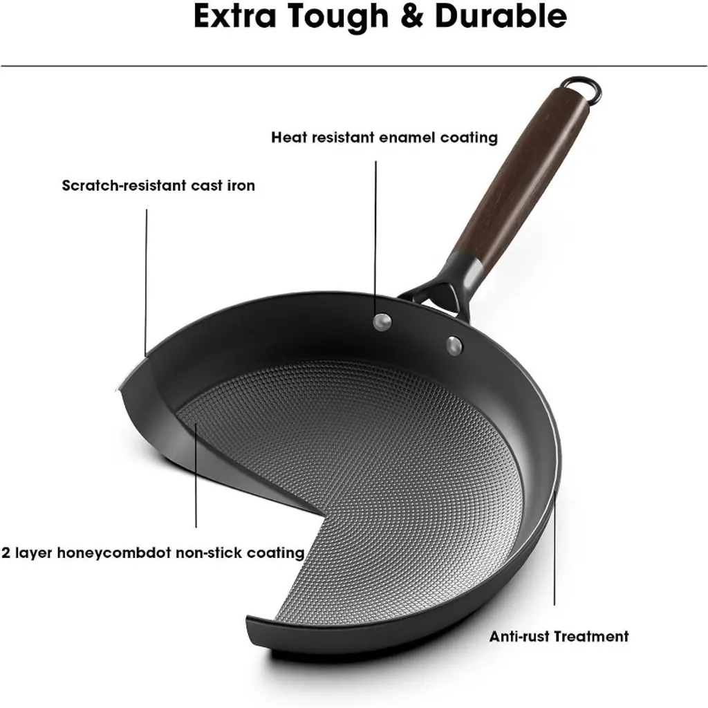 Nonstick Honeycomb Surface: This nonstick frying pan features a honeycomb pattern that keeps oil droplets locked in for a superior nonstick experience. Perfect for low-oil cooking and easy cleanup. Durable Cast Iron Skillet: Our cast iron skillet is made from high-quality cast iron, designed to last. This nonstick skillet can handle everyday cooking and high heat without warping or cracking, making it a reliable choice among nonstick pans. Light and Tough: With thin walls and a thick bottom, this non stick frying pan is less bulky. It¡¯s scratch-resistant, rust-resistant, and is not easy to deform. The ergonomic handle ensures a comfortable grip and stability, ideal for all your cooking needs. Removable Wooden Handle: Made of high-quality acacia wood, the handle is easy to install and remove. It¡¯s heat-resistant and stylish, featuring a hanging loop for convenient storage. Easy to Clean: This non stick pan ensures food won¡¯t stick, and it¡¯s easy to clean. While it¡¯s dishwasher safe (just remove the handle first), hand washing is recommended for the best results. Compatible with All Cooktops: Whether you use gas, electric, or induction stoves, this versatile cast iron skillet works on all types of cooktops, making it a great addition to your collection of skillets and frying pans. Tips: To extend the life of your nonstick frying pan, it¡¯s best to thoroughly dry it with a cloth after washing to prevent rust. Store the pan in a dry place and avoid moisture.