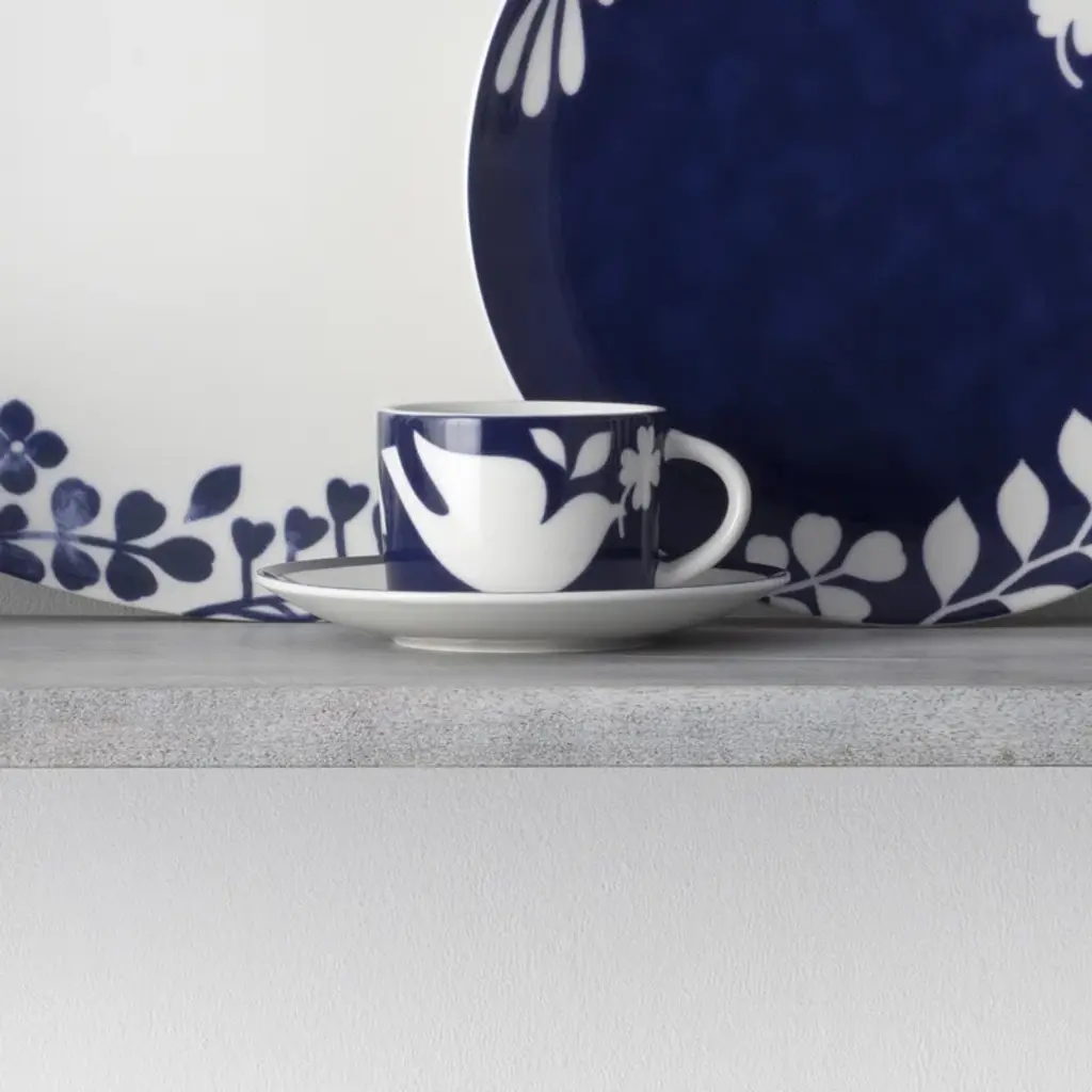 Bluefjord is a Scandinavian-inspired design that is blooming with crisp white whimsically-stylized floral motifs on a deep blue surface. Each piece incorporates these varied motifs in different ways that create a delightfully inspired mix-and-match place setting. The variation of design continues with the accessory pieces, resulting in a complete, yet eclectic, collection. Bluefjord offers traditional place setting components as well as serving pieces. This pattern is designed for daily use and is dishwasher safe.