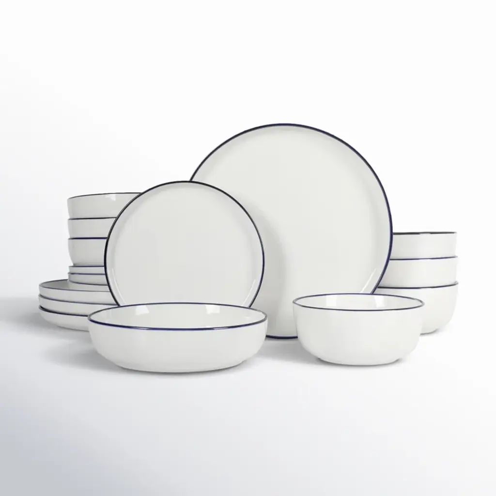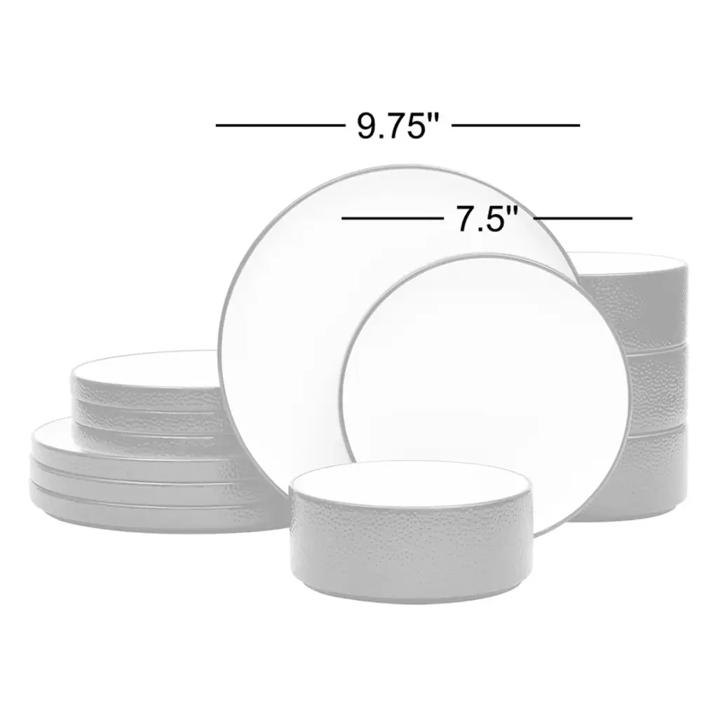This 12-piece dinnerware set offers a clean, minimalist look for all of your gatherings. It includes four dinner plates, four salad plates, and four bowls, all crafted from durable white porcelain with a contrasting exterior glaze. Each piece is safe for use in the dishwasher + microwave, and they stack to save cabinet space between meals.
