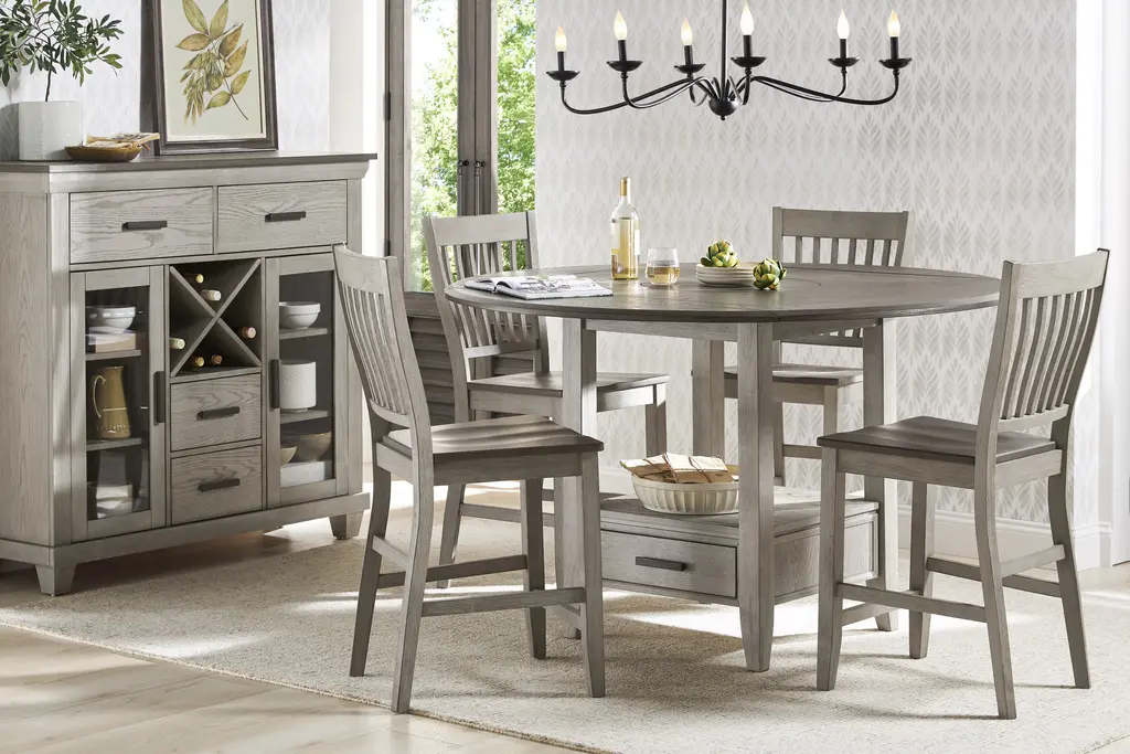 Pull up a seat in the cool and cosmopolitan North Fork dining collection, where laid-back vibes meet everyday versatility. Whether you're sipping coffee solo or gathering with friends, this transitional counter height stool makes every moment feel absolutely effortless. Finished in a relaxed two-tone gray, the stool features a classic slat-back design that brings the perfect blend of comfort and style to any space. Clean lines and a timeless silhouette make it a perfect match for the coordinating table or even standout on its own.