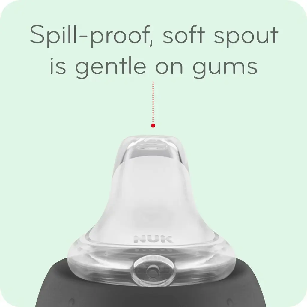 The NUK Large Learner Cup easily promotes baby’s transition from breast or bottle to sippy cup. This Learner Cup features a spill-proof soft spout that is gentle on teeth and gums, and it includes an air vent that helps reduce swallowed air. The cup also comes with easy-to-grip, removable handles that your growing child will love. NUK Learner Cups are BPA free and dishwasher safe. Our 10 oz Learner cups are recommended for ages 8 months and older.
