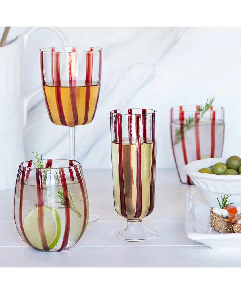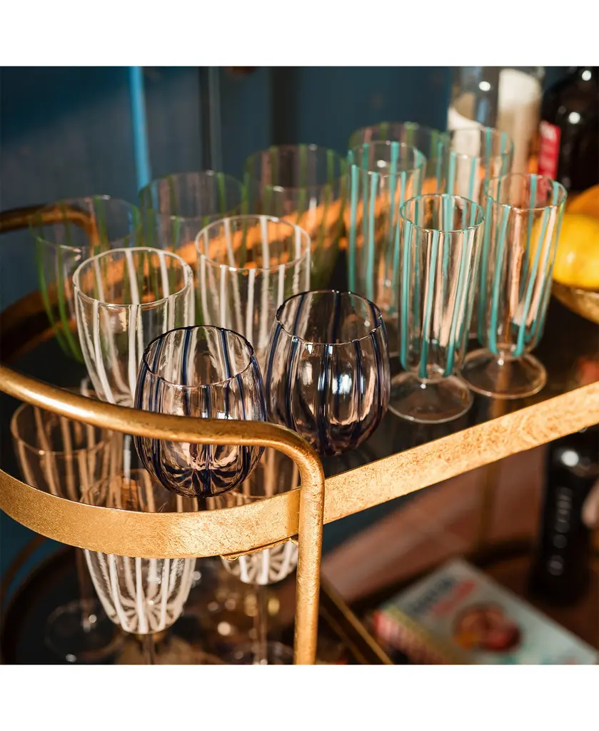 Mouthblown by skilled artisans, the Nuovo Collection features painterly stripes gliding down each glass and the result is a fresh and fun addition to your table.