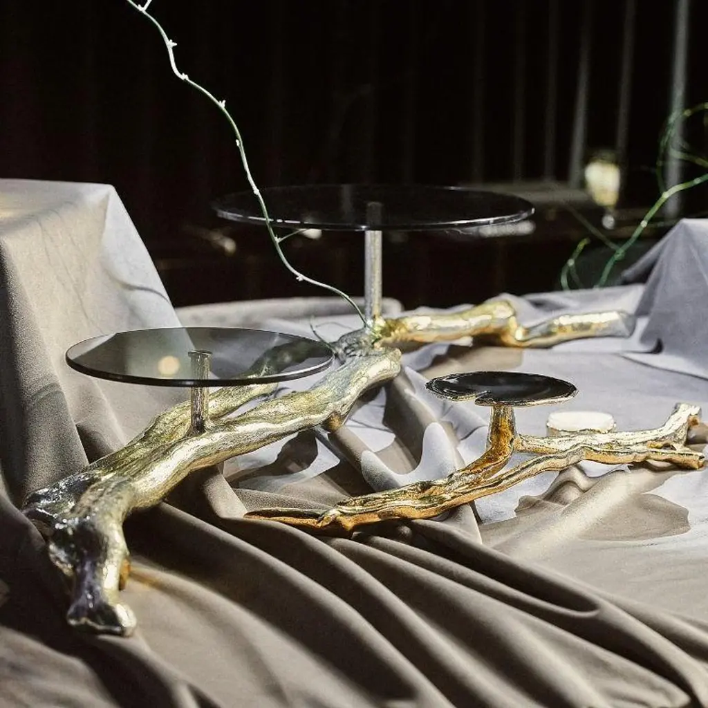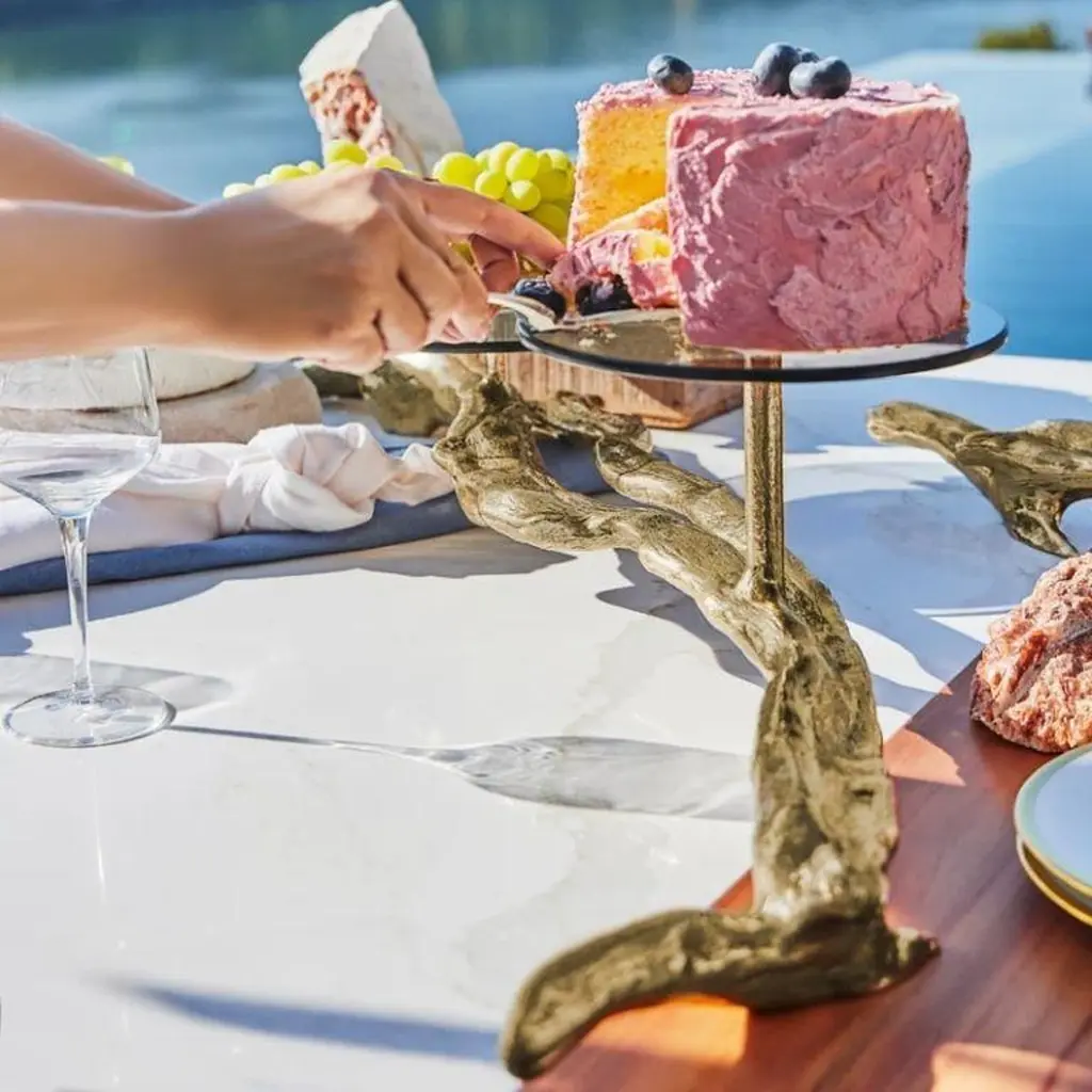 Inspired by marshes and serene waters, the Nuphar Cake Stand emerges as a stunning organic serveware piece, blending natural beauty with refined elegance.Designed to capture the fluidity of nature, its form exhibits graceful movement, embodying both delicacy and strength. The incorporation of leaf and root imagery is masterfully achieved through a sophisticated reinterpretation, making Nuphar Cake Stand a unique addition to any setting.Its intricate detailing and sensitive design transport us into a realm reminiscent of the aquatic hemisphere, evoking tranquility and harmony. Whether used as a cake stand, buffet centerpiece, or decorative display, Nuphar seamlessly enhances any dining experience. Its sculptural presence adds an artistic touch, elevating the presentation of desserts, fruits, or culinary creations with effortless sophistication.