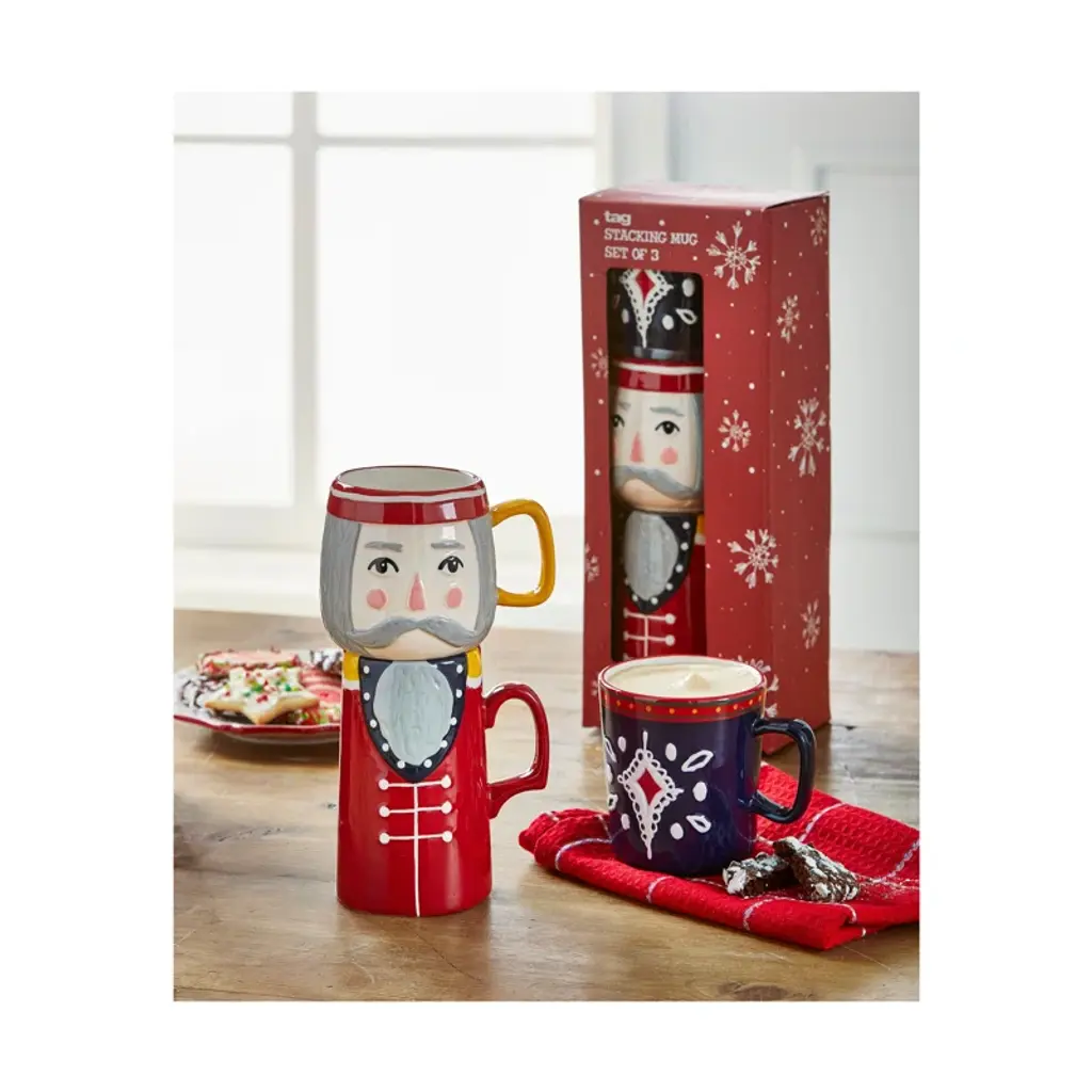get extra cozy with this adorable stacking mug set! features beautiful nutcracker design and hand-painted detail. perfect to display on the kitchen counter or coffee bar area in the home. showcase your individual style and personality while enjoying your favorite drinks like coffee, tea and hot cocoa! retail ready packaging. mix and match with a range of mug selections from tag.