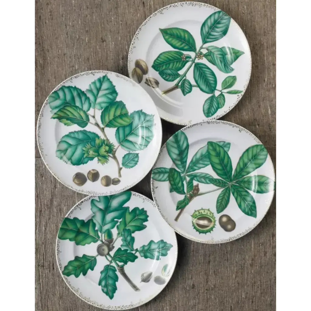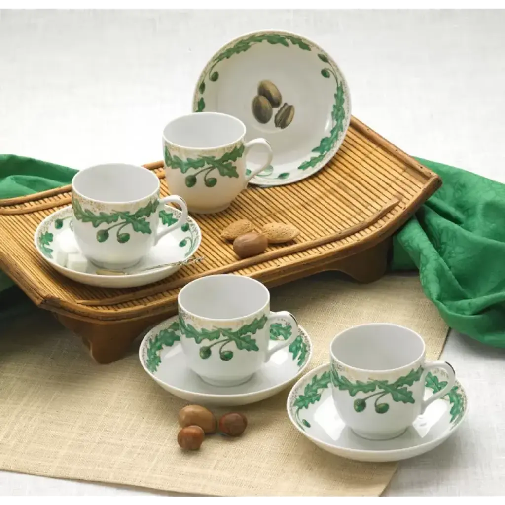 The teacups have a leaf border and the same tree nuts and leaves as the plates. Lift the cup to find the nut on the saucer. A favorite with brides, Mottahedeh specializes in luxurious patterns and unique, elegant shapes that are reproduced from china found in museums and historical societies. The patterns feature complex and vibrant colors, and hand-painted gold decoration. The pieces are surprisingly fresh and timely, and look wonderful in both contemporary and traditional dining rooms.