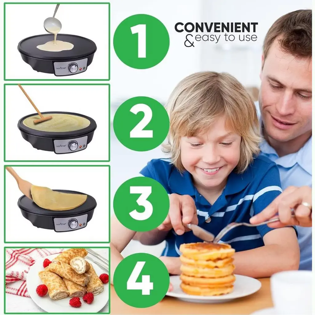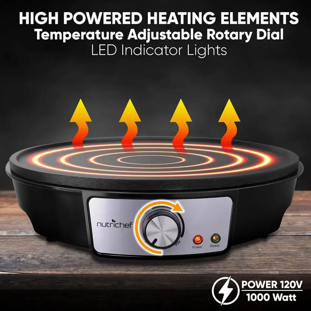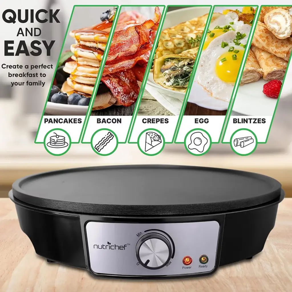 The NutriChef Electric Griddle Hot Plate is the perfect solution for quick and convenient meal preparation. With its compact design, this versatile cooktop allows you to easily whip up delicious breakfasts, including pancakes, eggs, and bacon, or create delightful desserts like crepes and blintzes. The non-stick aluminum cooking surface features a generous 12-inch diameter, ensuring ample cooking space for all your favorite foods. Adjust the temperature effortlessly with the rotary dial for precise cooking results every time. Enjoy ultra-quiet operation while you cook and keep an eye on your meals with the helpful LED indicator lights. Designed to be safe on any countertop or tabletop, this electric griddle is a must-have for any kitchen!