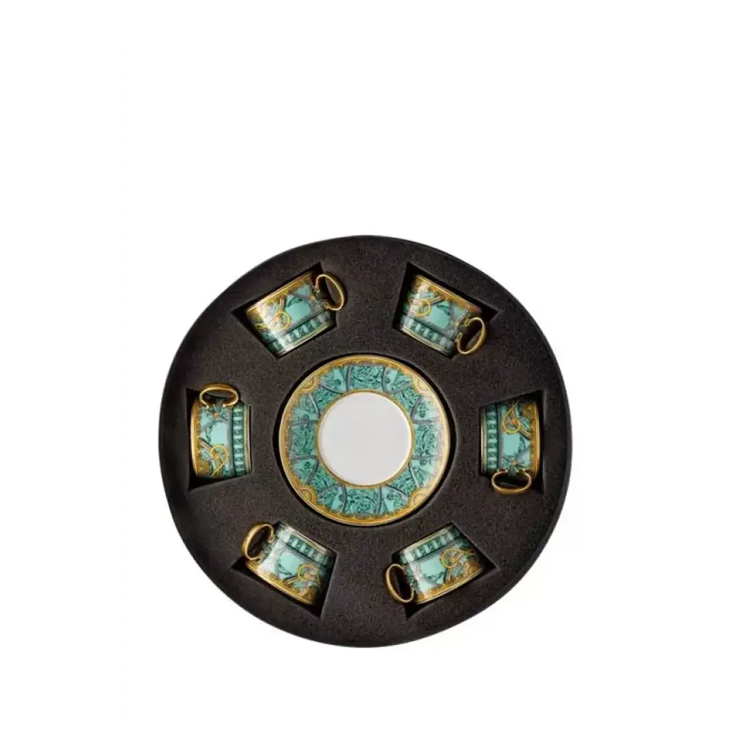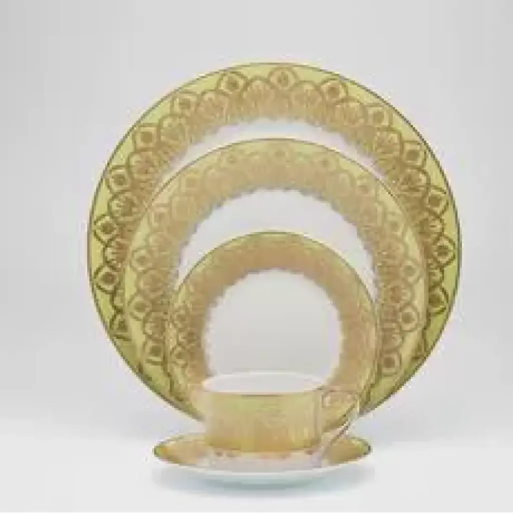 A classic pattern from Royal Limoges, Oasis Green dinnerware is in the "Recamier" shape with a lush design of green and gold. Five-piece place setting includes dinner plate, dessert plate, bread/butter plate, teacup, and saucer. As the oldest porcelain factory in the French city of Limoges, Royal Limoges boasts a long history of creating hand crafted dinnerware from its own kaolin clay. Since 1797, its exclusive patterns have been enjoyed by clients worldwide.