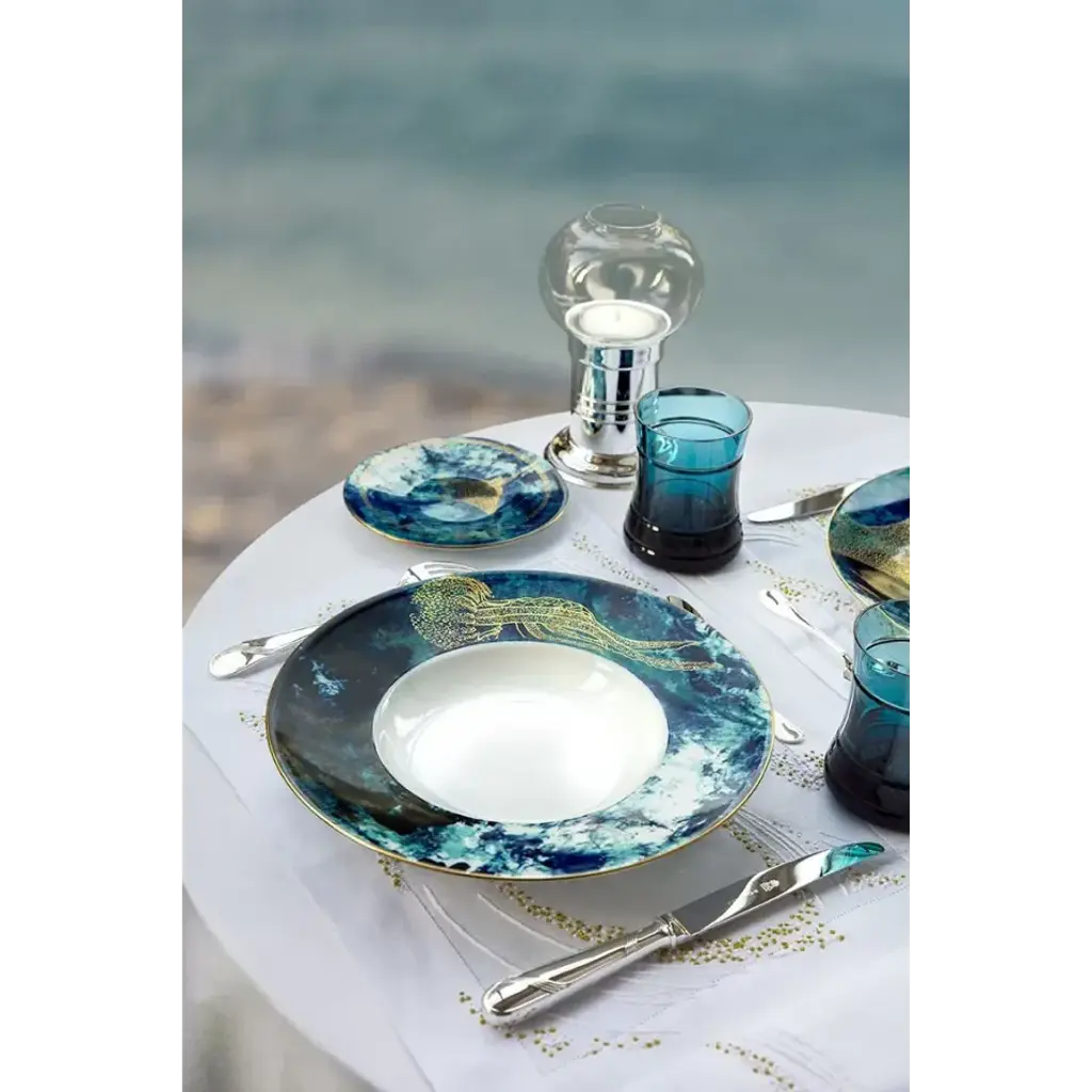 The Haviland collections are distinguished by the elegance of the decorations and the delicacy of the gold or platinum finishes. Remarkable for the retention and resistence of their colors, the timeless Haviland collections endure through time. To this day, Haviland remains one of the few porcelain makers with 100% of its production entirely made in Limoges. Ocean Blue features extra white porcelain bodies, delicate designs of jellyfish and rays in brilliant gold, and an intricate sea-like background. Haviland Porcelain was founded by David Haviland, an American who moved from New York to France after he was brought a broken tea cup to match and recognized the quality and color of the old piece of porcelain. Filled with curiosity, he went to France to find the factory where the cup had been made, but the samples he was sent were not up to his standards. So in 1841, he moved to Limoges to set up his own factory. Traditional French dinnerware was usually produced in Limoges and sent to Paris for decoration. Haviland insisted on setting up a studio within his factory to have more control over the designs. Renowned artists, including Cocteau, Dali, and Kandinsky have played a role in the company's designs. Today, Haviland is one of the premier names in French porcelain dinnerware, sought by collectors all over the world. Clients have included the White House, Empress Eugenie, General de Gaulle, Jacques Chirac, the Emperor of Japan, and the Royal Court of Morocco.