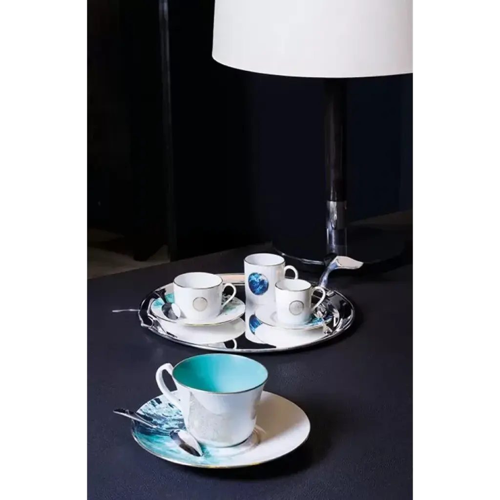The Haviland collections are distinguished by the elegance of the decorations and the delicacy of the gold or platinum finishes. Remarkable for the retention and resistence of their colors, the timeless Haviland collections endure through time. To this day, Haviland remains one of the few porcelain makers with 100% of its production entirely made in Limoges. Ocean Blue features extra white porcelain bodies, delicate designs of jellyfish and rays in brilliant gold, and an intricate sea-like background. Haviland Porcelain was founded by David Haviland, an American who moved from New York to France after he was brought a broken tea cup to match and recognized the quality and color of the old piece of porcelain. Filled with curiosity, he went to France to find the factory where the cup had been made, but the samples he was sent were not up to his standards. So in 1841, he moved to Limoges to set up his own factory. Traditional French dinnerware was usually produced in Limoges and sent to Paris for decoration. Haviland insisted on setting up a studio within his factory to have more control over the designs. Renowned artists, including Cocteau, Dali, and Kandinsky have played a role in the company's designs. Today, Haviland is one of the premier names in French porcelain dinnerware, sought by collectors all over the world. Clients have included the White House, Empress Eugenie, General de Gaulle, Jacques Chirac, the Emperor of Japan, and the Royal Court of Morocco.