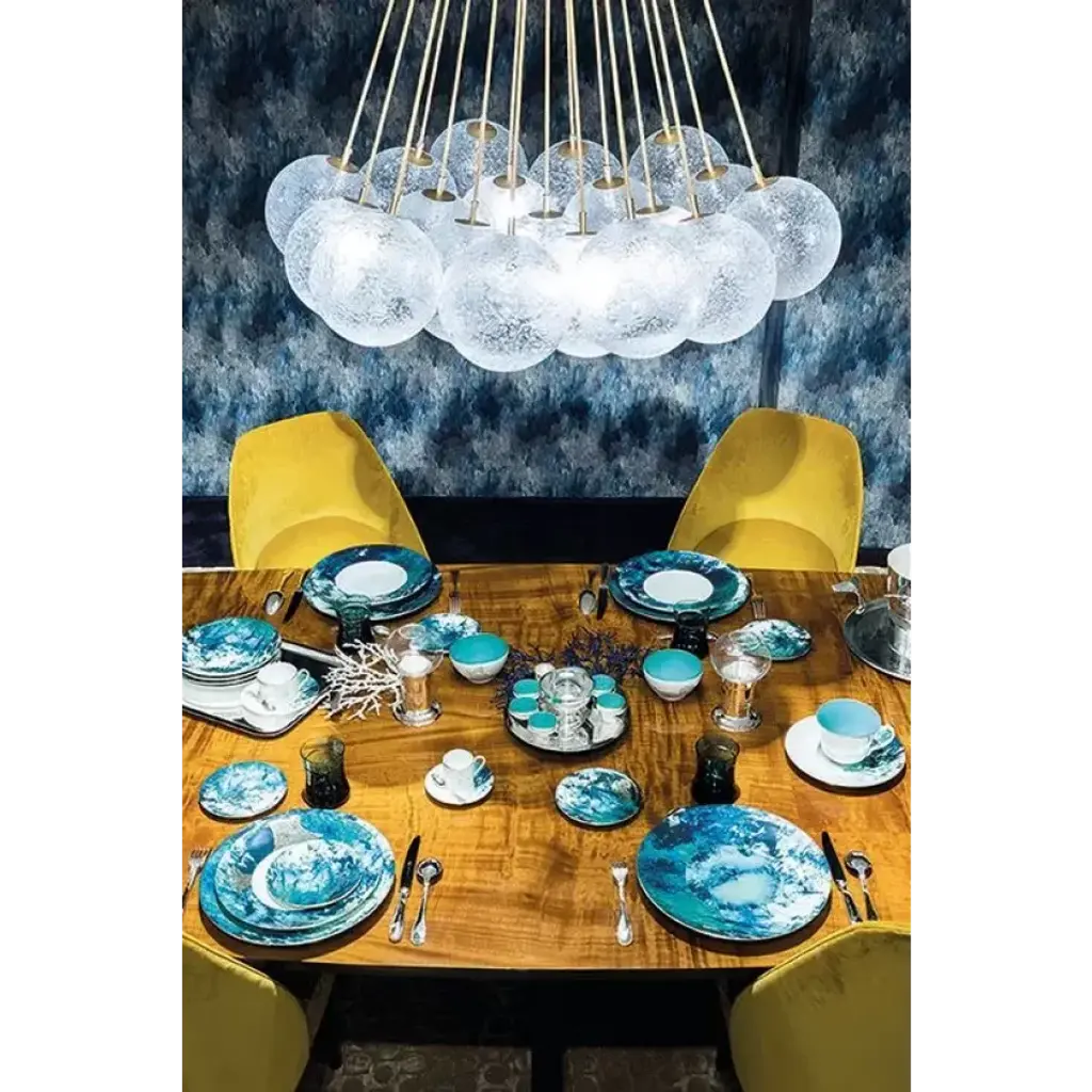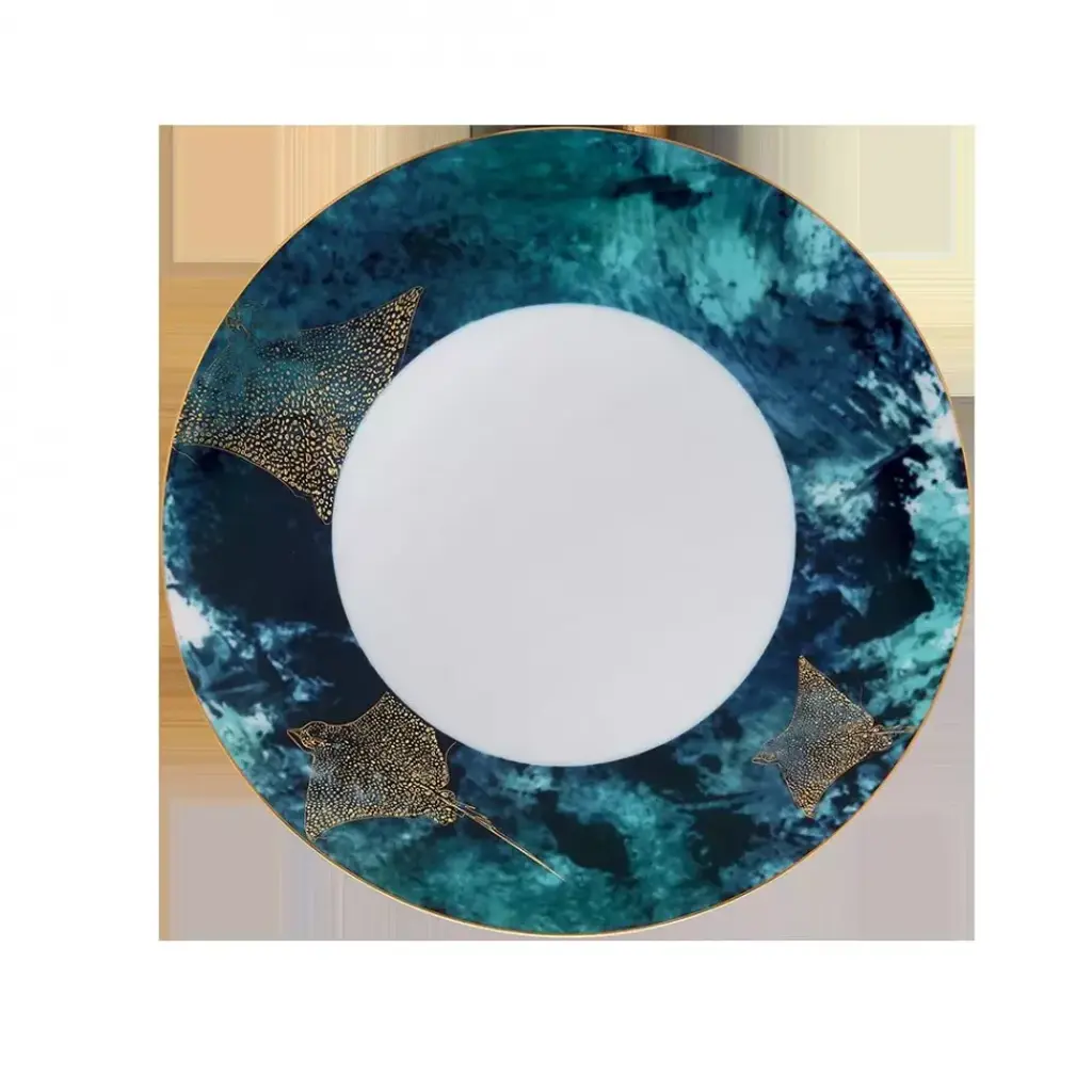 The Haviland collections are distinguished by the elegance of the decorations and the delicacy of the gold or platinum finishes. Remarkable for the retention and resistence of their colors, the timeless Haviland collections endure through time. To this day, Haviland remains one of the few porcelain makers with 100% of its production entirely made in Limoges. Ocean Blue features extra white porcelain bodies, delicate designs of jellyfish and rays in brilliant gold, and an intricate sea-like background. Haviland Porcelain was founded by David Haviland, an American who moved from New York to France after he was brought a broken tea cup to match and recognized the quality and color of the old piece of porcelain. Filled with curiosity, he went to France to find the factory where the cup had been made, but the samples he was sent were not up to his standards. So in 1841, he moved to Limoges to set up his own factory. Traditional French dinnerware was usually produced in Limoges and sent to Paris for decoration. Haviland insisted on setting up a studio within his factory to have more control over the designs. Renowned artists, including Cocteau, Dali, and Kandinsky have played a role in the company's designs. Today, Haviland is one of the premier names in French porcelain dinnerware, sought by collectors all over the world. Clients have included the White House, Empress Eugenie, General de Gaulle, Jacques Chirac, the Emperor of Japan, and the Royal Court of Morocco.