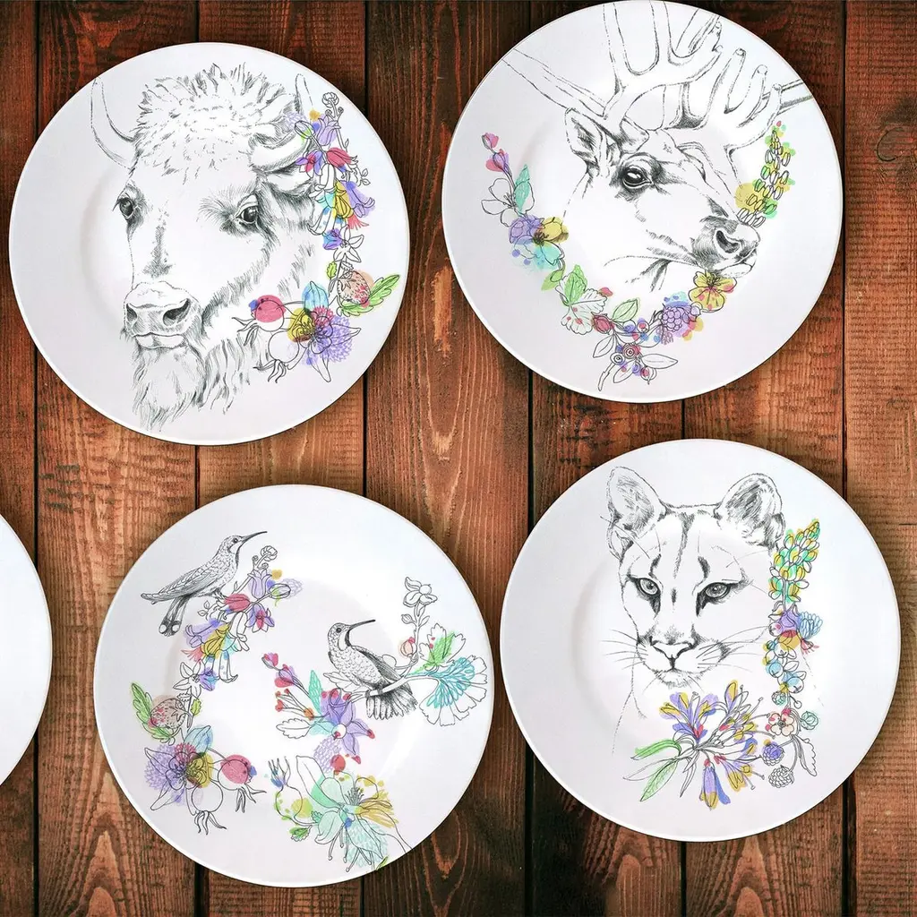 A black bear, a typical animal of the woods is gently painted on this dinner plate, with soft black tones and it is surrounded by a delicate and intriguing mix of wild flowers and leaves reinterpreted in a fresh and poetic color way. These porcelain plates can be perfectly mixed with the "Grandma's Garden Collection" in order to obtain an elegant balance of wild animals and flowers. Other animals are available upon request. Due to the use of manual techniques, each item will vary slightly. Oven and dishwasher safe. Made in Italy.