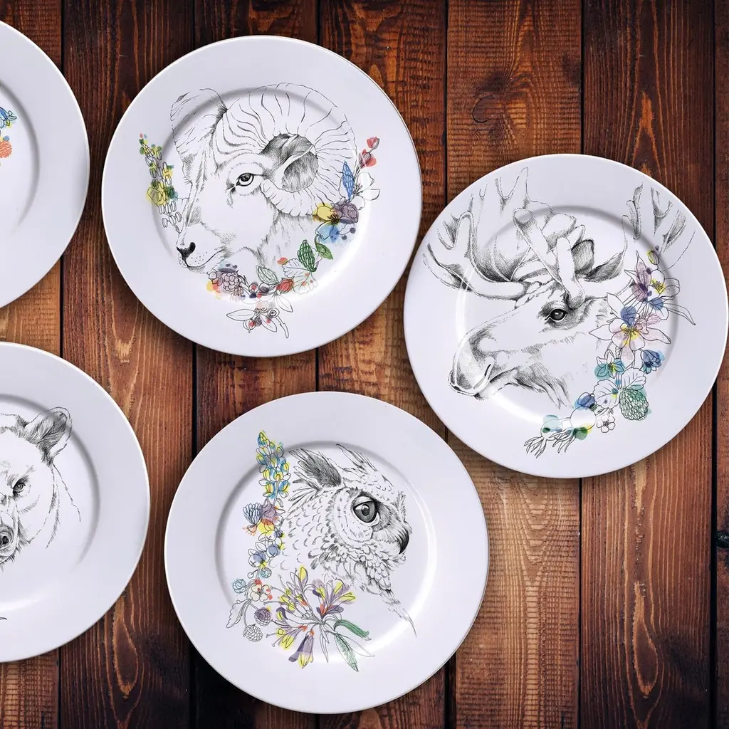 A Caribou, a typical animal of the woods is gently painted on this dinner plate with soft black tones and it is surrounded by a delicate and intriguing mix of wild flowers and leaves reinterpreted in a fresh and poetic color way. These porcelain plates can be perfectly mixed with the "Grandma's Garden Collection" in order to obtain an elegant balance of wild animals and flowers. Other animals are available upon request. Due to the use of manual techniques, each item will vary slightly. Oven and dishwasher safe. Made in Italy.