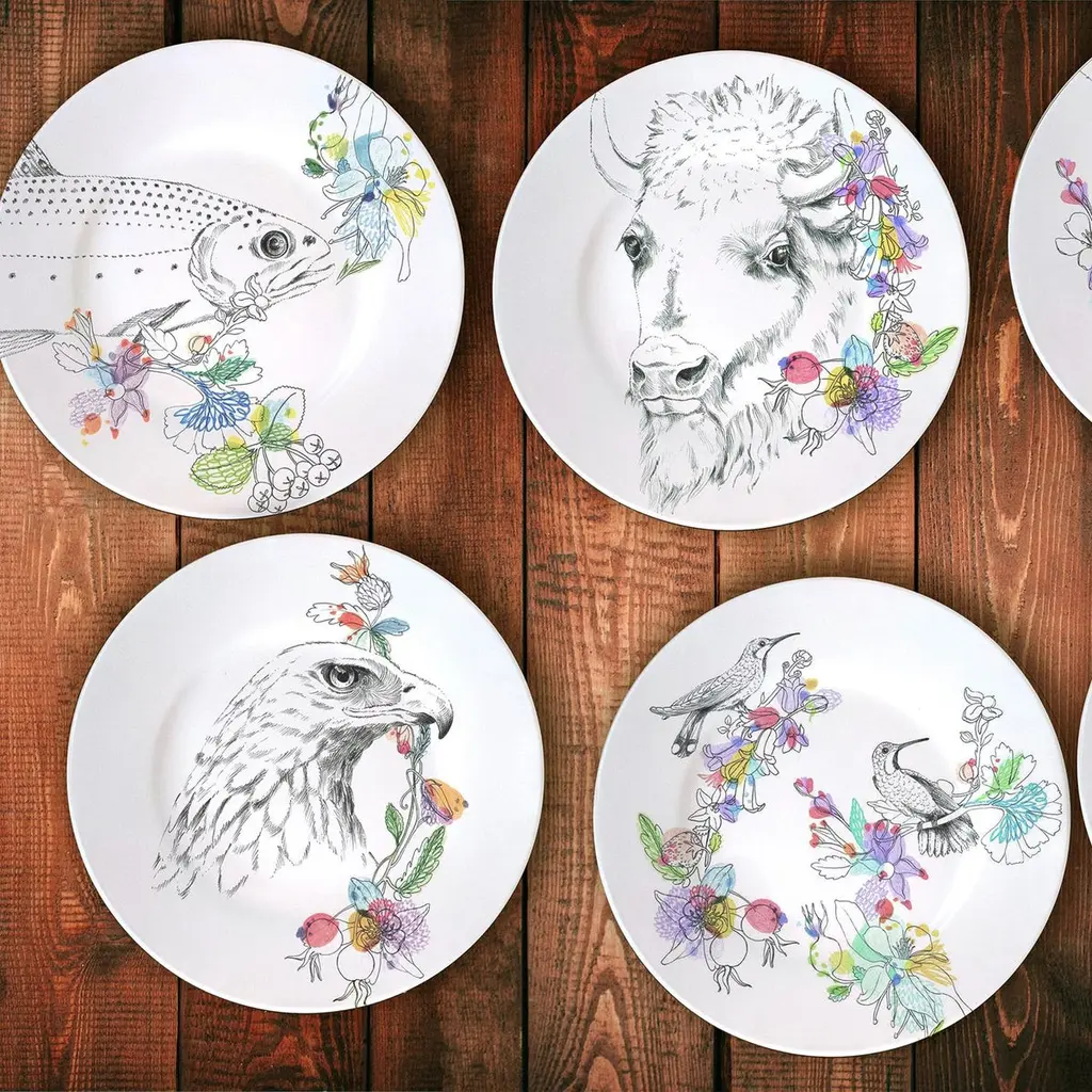 An owl, a typical animal of the woods is gently painted on this dinner plate, with soft black tones and it is surrounded by a delicate and intriguing mix of wild flowers and leaves reinterpreted in a fresh and poetic color way. These porcelain plates can be perfectly mixed with the "Grandma's Garden Collection" in order to obtain an elegant balance of wild animals and flowers. Other animals are available upon request. Due to the use of manual techniques, each item will vary slightly. Oven and dishwasher safe. Made in Italy.