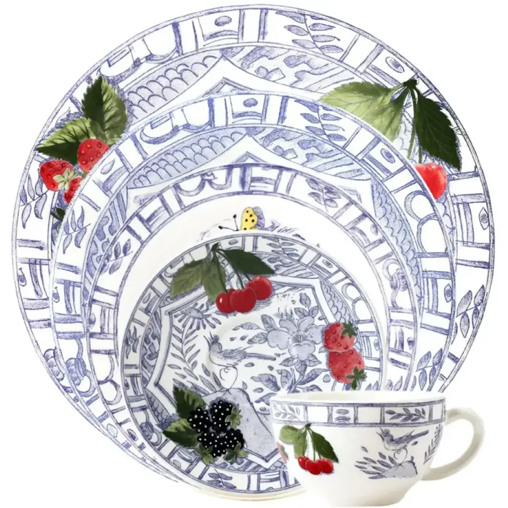 Starting with a singing bird surrounded by bunches of ripe fruit, Gien's Oiseau Blue Fruits dinnerware is a playful pattern painted in soothing blue and white. Designed by Isabelle de Borchgrave; faience earthenware made in France by Gien. Four-piece place setting includes dinner plate, dessert plate, bowl, and mug. Five-piece place setting includes dinner plate, dessert plate, canape plate, US tea cup, and saucer. A perfect companion pattern for Oiseau Blue and White. Located near the Loire Valley castles, the Faïencerie de Gien has been synonymous with prestigious faience tableware and decorative objects since its founding in 1821. Gien pieces are renowned for their warm white clays decorated with traditional motifs reminiscent of the French countryside.