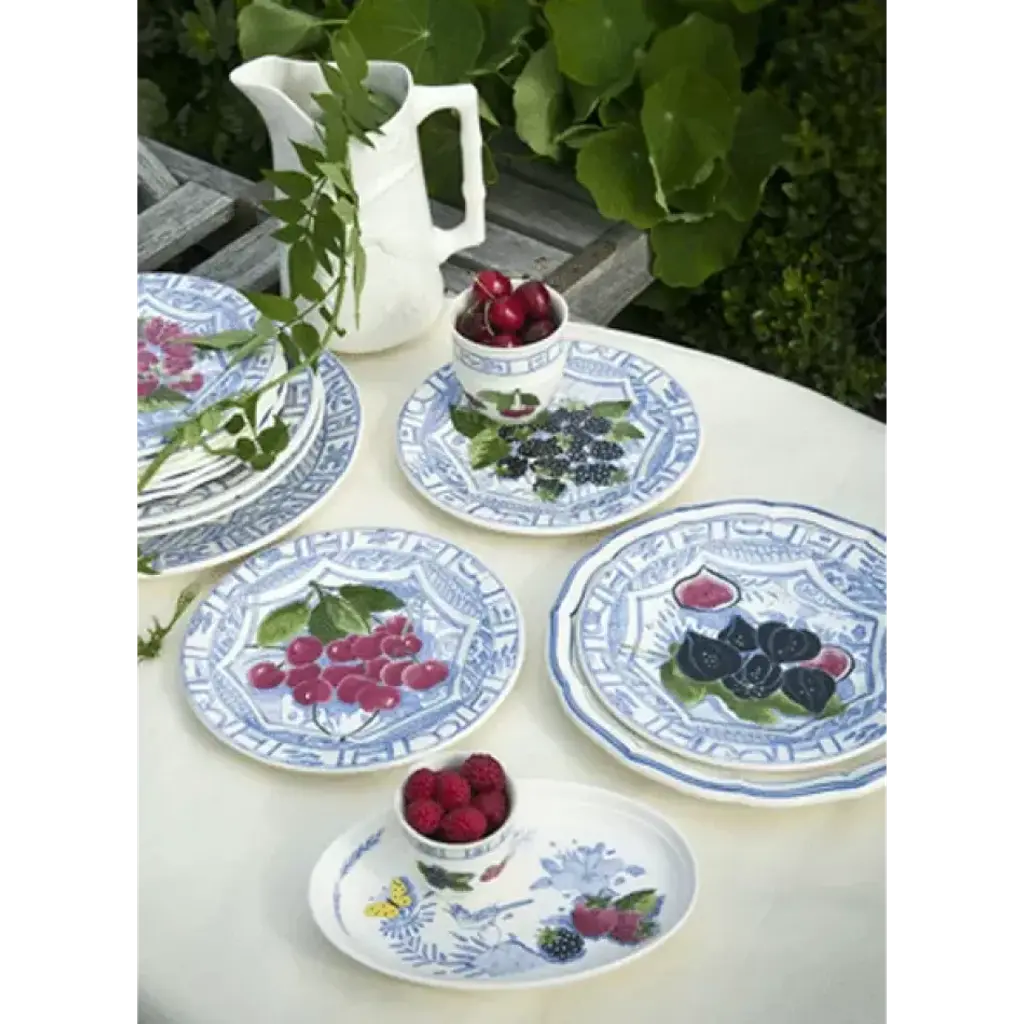 Starting with a singing bird surrounded by bunches of ripe fruit, Gien's Oiseau Blue Fruits dinnerware is a playful pattern painted in soothing blue and white. Designed by Isabelle de Borchgrave; faience earthenware made in France by Gien. Four-piece place setting includes dinner plate, dessert plate, bowl, and mug. Five-piece place setting includes dinner plate, dessert plate, canape plate, US tea cup, and saucer. A perfect companion pattern for Oiseau Blue and White. Located near the Loire Valley castles, the Faïencerie de Gien has been synonymous with prestigious faience tableware and decorative objects since its founding in 1821. Gien pieces are renowned for their warm white clays decorated with traditional motifs reminiscent of the French countryside.