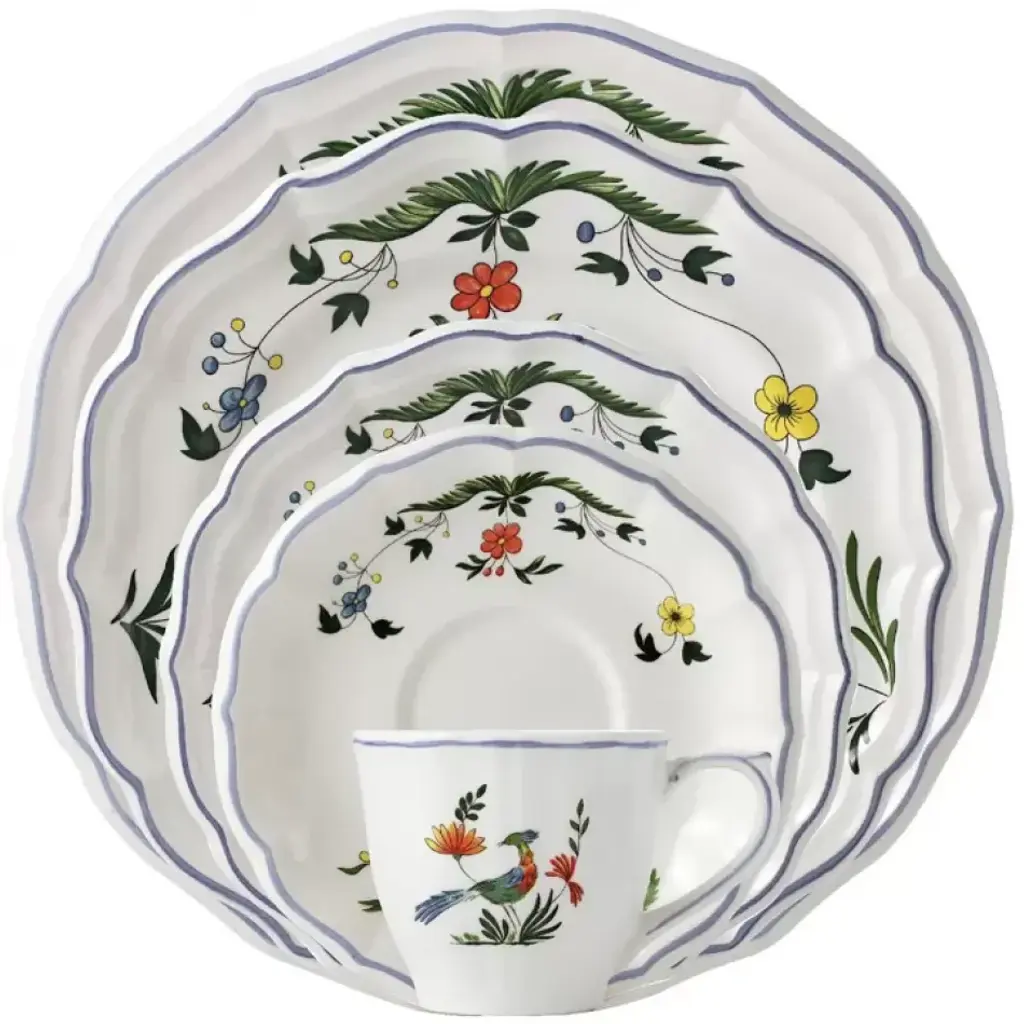Translated as "Birds of Paradise" in English, Gien's Oiseaux de Paradis dinnerware was first designed in 1865 and has been popular ever since. Oiseaux de Paradis is the artist's poem to exotic birds and flowers. Faience earthenware made in France by Gien. Four-piece place setting includes dinner plate, dessert plate, bowl, and mug. Five-piece place setting includes dinner plate, dessert plate, canape plate, US tea cup, and saucer. A perfect companion pattern for Oiseau Blue Fruits. Located near the Loire Valley castles, the Faïencerie de Gien has been synonymous with prestigious faience tableware and decorative objects since its founding in 1821. Gien pieces are renowned for their warm white clays decorated with traditional motifs reminiscent of the French countryside.