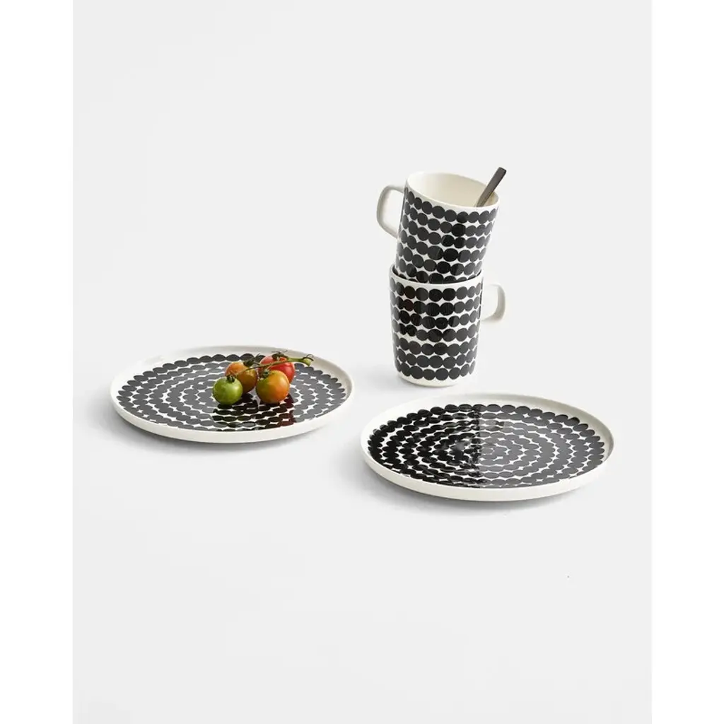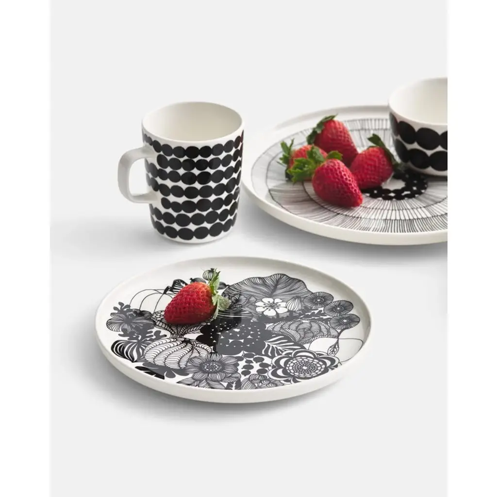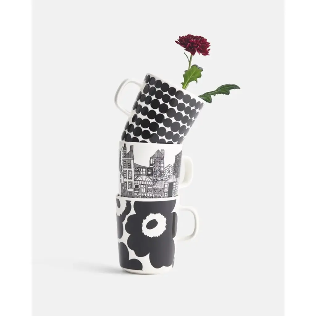 Marimekko’s Räsymatto mug features Maija Louekari’s cheerful pattern that was inspired by traditional rag rugs. Marimekko's Siirtolapuutarha collection has a pleasant feel of nostalgia. The clean, streamlined Oiva ceramic tableware was designed by Sami Ruotsalainen, and the Siirtolapuutarha and Räsymatto patterns were drawn by Maija Louekari. They tell stories about country life in an urban environment. The collection’s cups, mugs, bowls, plates and textiles can be combined in various ways and according to mood and occasion – they are perfect for both everyday use and festivities. Räsymatto and Siirtolapuutarha will cheer up your home for years to come.
