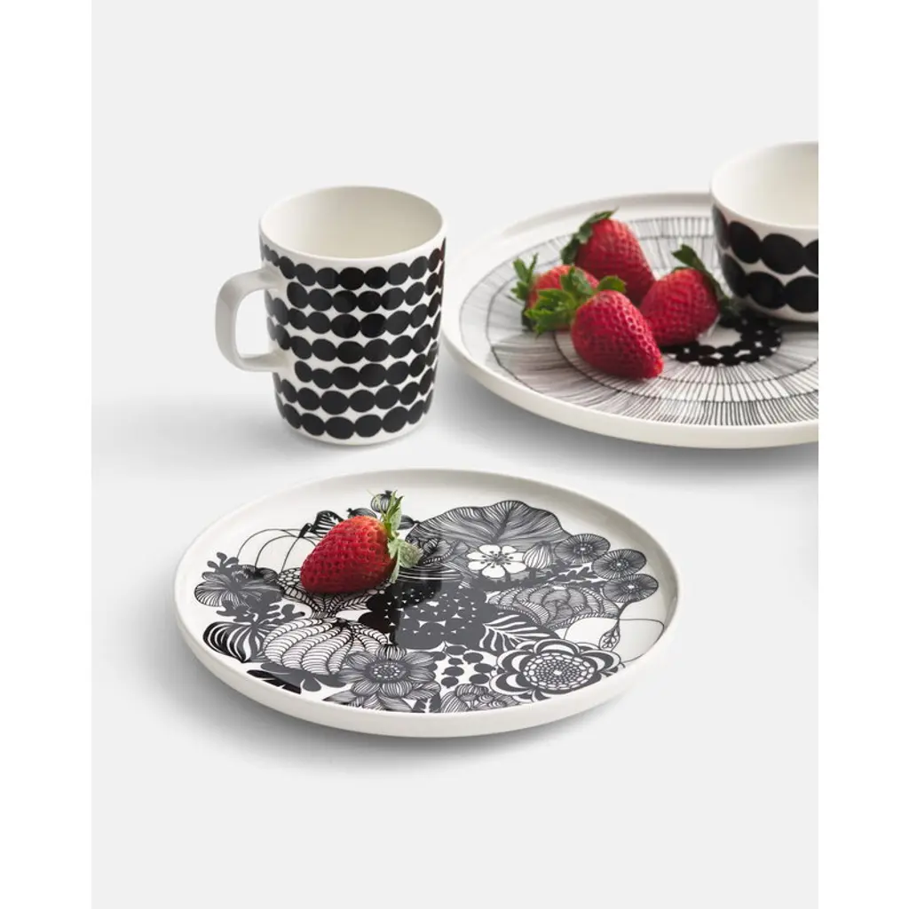 Marimekko’s round Siirtolapuutarha plate features Maija Louekari’s cheerful pattern that depicts beautiful summer flowers growing in allotment gardens. Marimekko's Siirtolapuutarha collection has a pleasant feel of nostalgia. The clean, streamlined Oiva ceramic tableware was designed by Sami Ruotsalainen, and the Siirtolapuutarha and Räsymatto patterns were drawn by Maija Louekari. They tell stories about country life in an urban environment. The collection’s cups, mugs, bowls, plates and textiles can be combined in various ways and according to mood and occasion – they are perfect for both everyday use and festivities. Räsymatto and Siirtolapuutarha will cheer up your home for years to come.