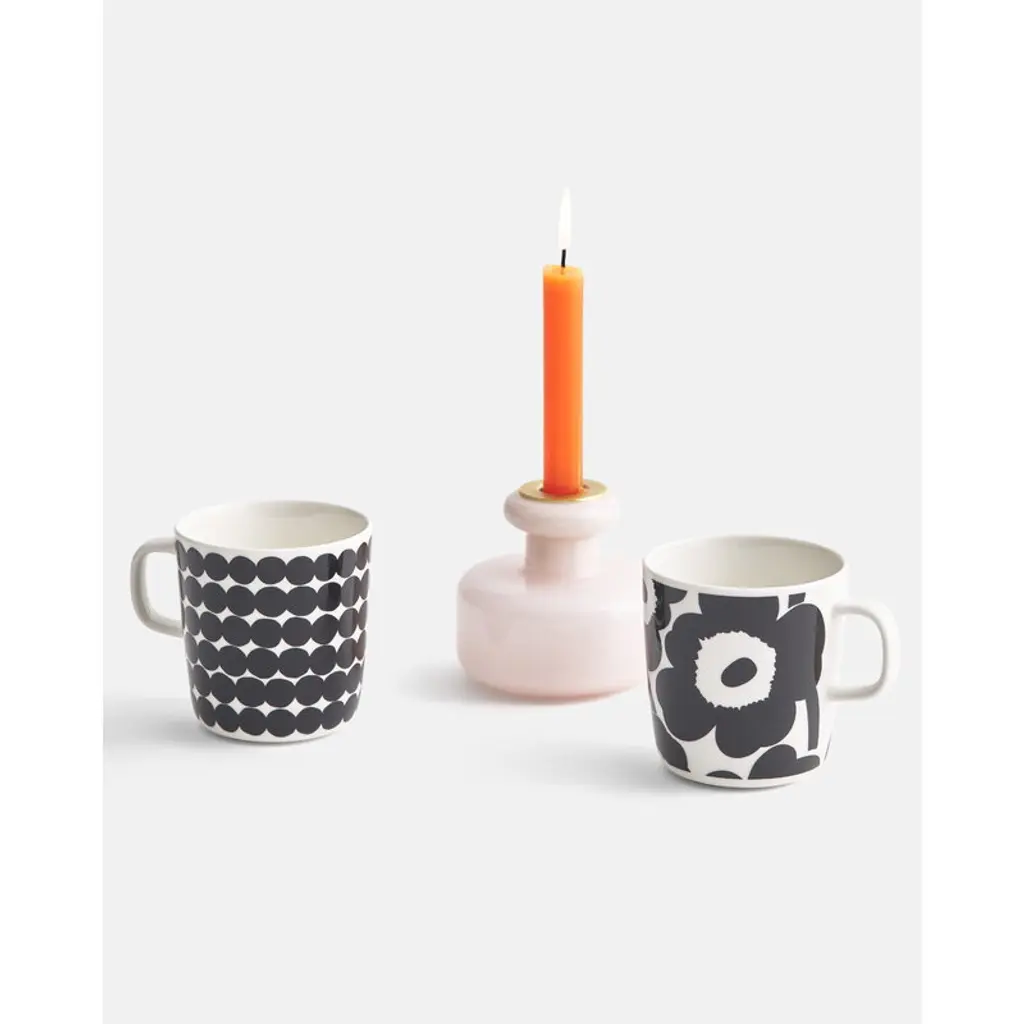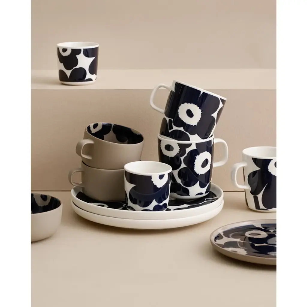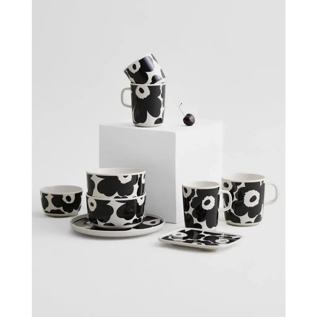 Marimekko’s Unikko mug features Maija Isola’s iconic floral pattern in stylish shades of black and white. The ceramic mug is part of Sami Ruotsalainen’s clean-lined Oiva tableware collection that suits both casual and festive settings. The Unikko pattern came about in 1964 after Armi Ratia, the founder of Marimekko, had announced in public that no floral fabrics are designed at Marimekko. Maija Isola did not accept rules or restrictions and designed in protest a complete collection of bold floral patterns: Unikko, a Finnish word that means poppy. Today, Unikko is one of Marimekko's best-known patterns and recognized around the world.