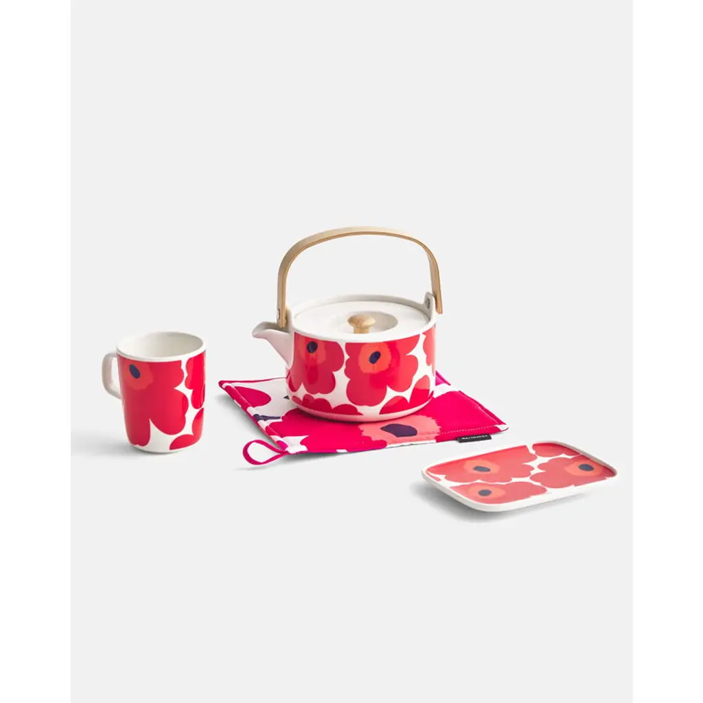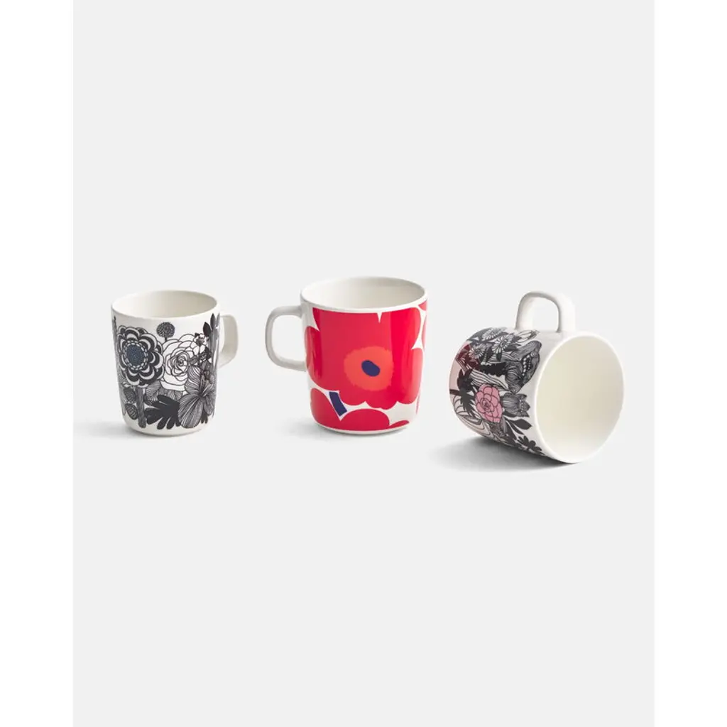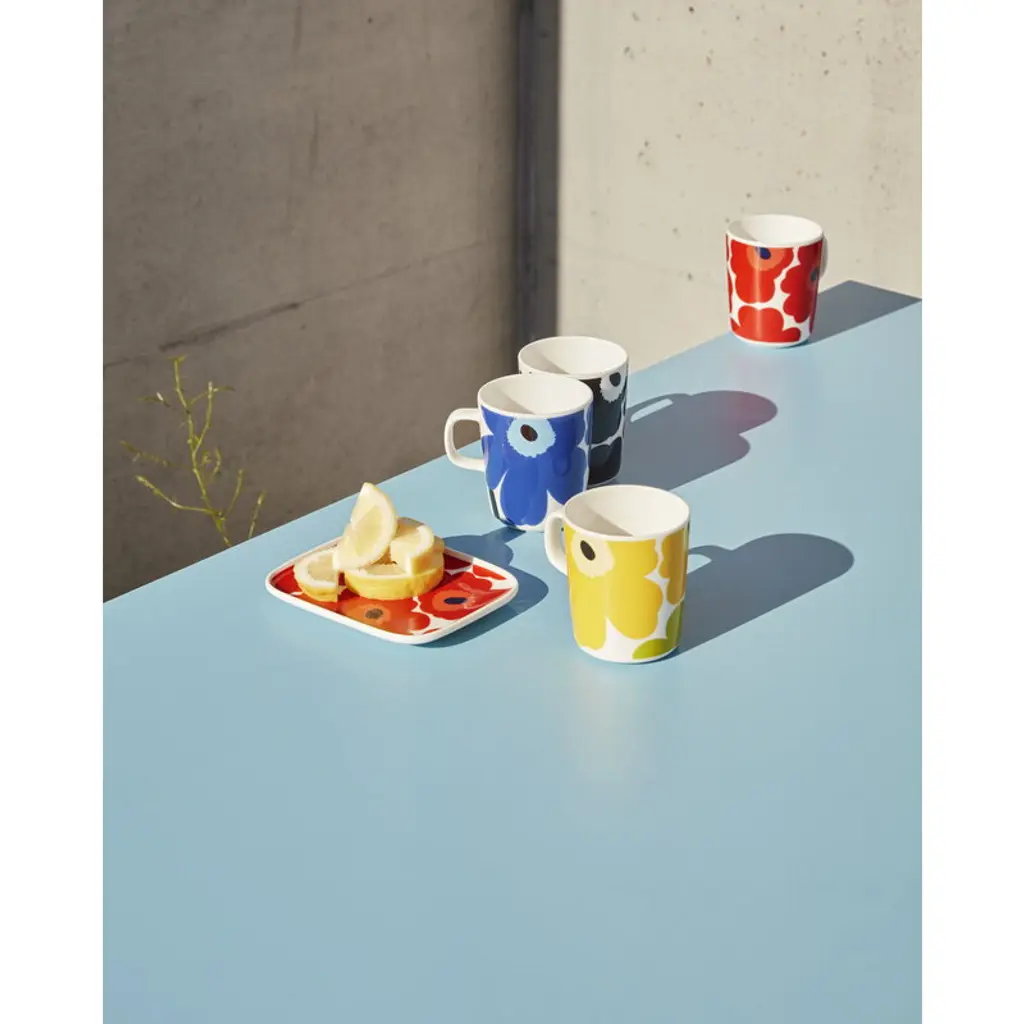 Marimekko’s 8.45 fl oz (2,5 dl) Unikko mug features Maija Isola’s iconic floral pattern in vivid shades of red. The ceramic mug is part of Sami Ruotsalainen’s clean-lined Oiva tableware collection that suits both casual and festive settings. The Unikko pattern came about in 1964 after Armi Ratia, the founder of Marimekko, had announced in public that no floral fabrics are designed at Marimekko. Maija Isola did not accept rules or restrictions and designed in protest a complete collection of bold floral patterns: Unikko, a Finnish word that means poppy. Today, Unikko is one of Marimekko's best-known patterns and recognized around the world.