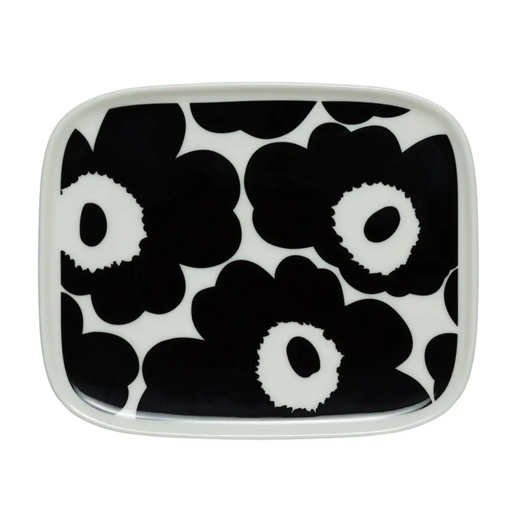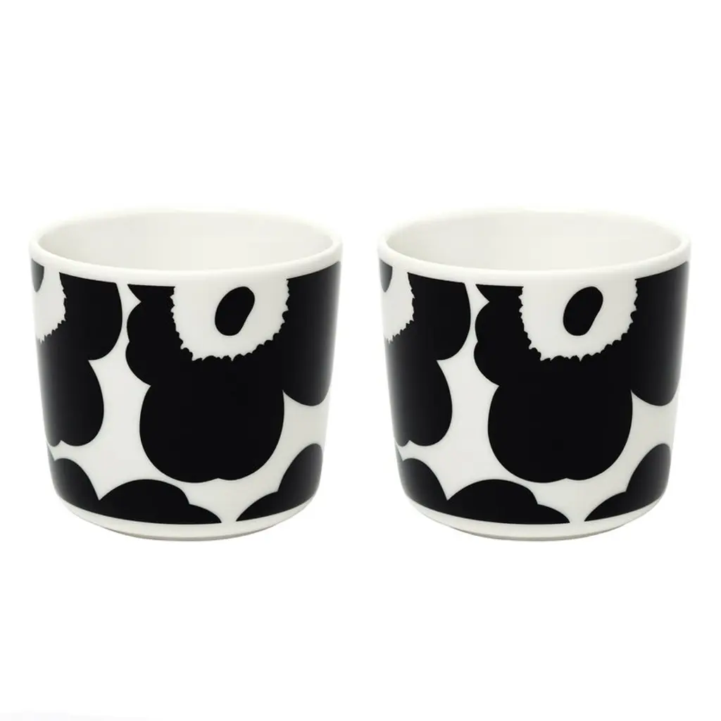 Marimekko’s Unikko tableware set is adorned with Maija Isola’s iconic floral pattern in stylish shades of black and white. The ceramic mugs and plates are ideal for a breakfast table for two, but their minimalist forms and bold decorations add a dose of Nordic flair to any table setting from an everyday meal to a special occasion. The instantly recognizable Unikko pattern came about in 1964 after Armi Ratia, the founder of Marimekko, had announced in public that no floral fabrics would be designed at Marimekko. Textile designer Maija Isola, however, was not one for rules or restrictions, and in protest, she designed a complete collection of bold floral patterns named Unikko, Finnish for "poppy". Today, Unikko is one of Marimekko's best-known patterns, and it adorns a variety of objects from fabrics and bed linen to Sami Ruotsalainen’s clean-lined Oiva tableware collection. The Unikko breakfast set includes two Oiva mugs with a capacity of 8.45 fl oz (2.5 dl) and two Oiva plates with a diameter of 7.87 x 0 in (20 x cm. cm).