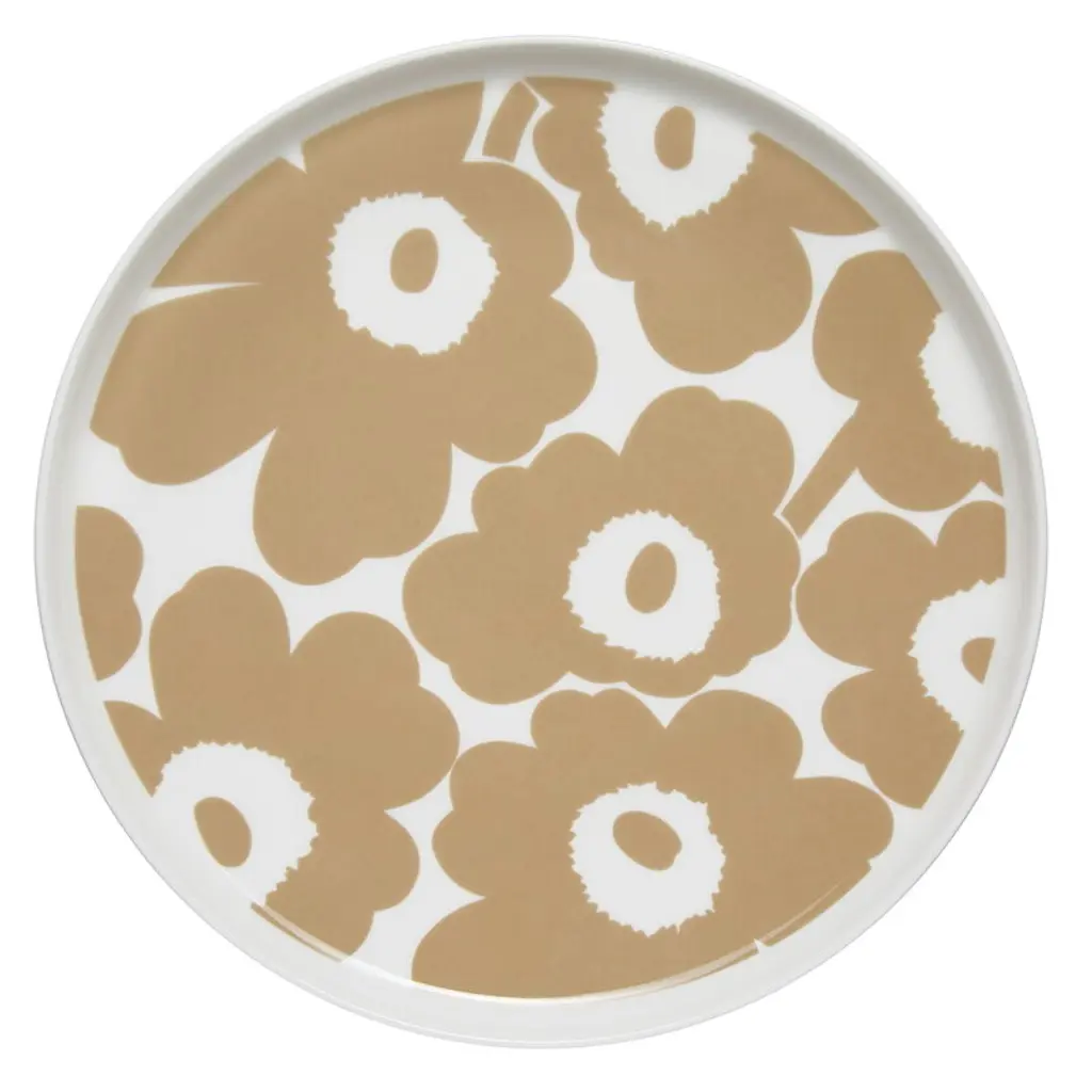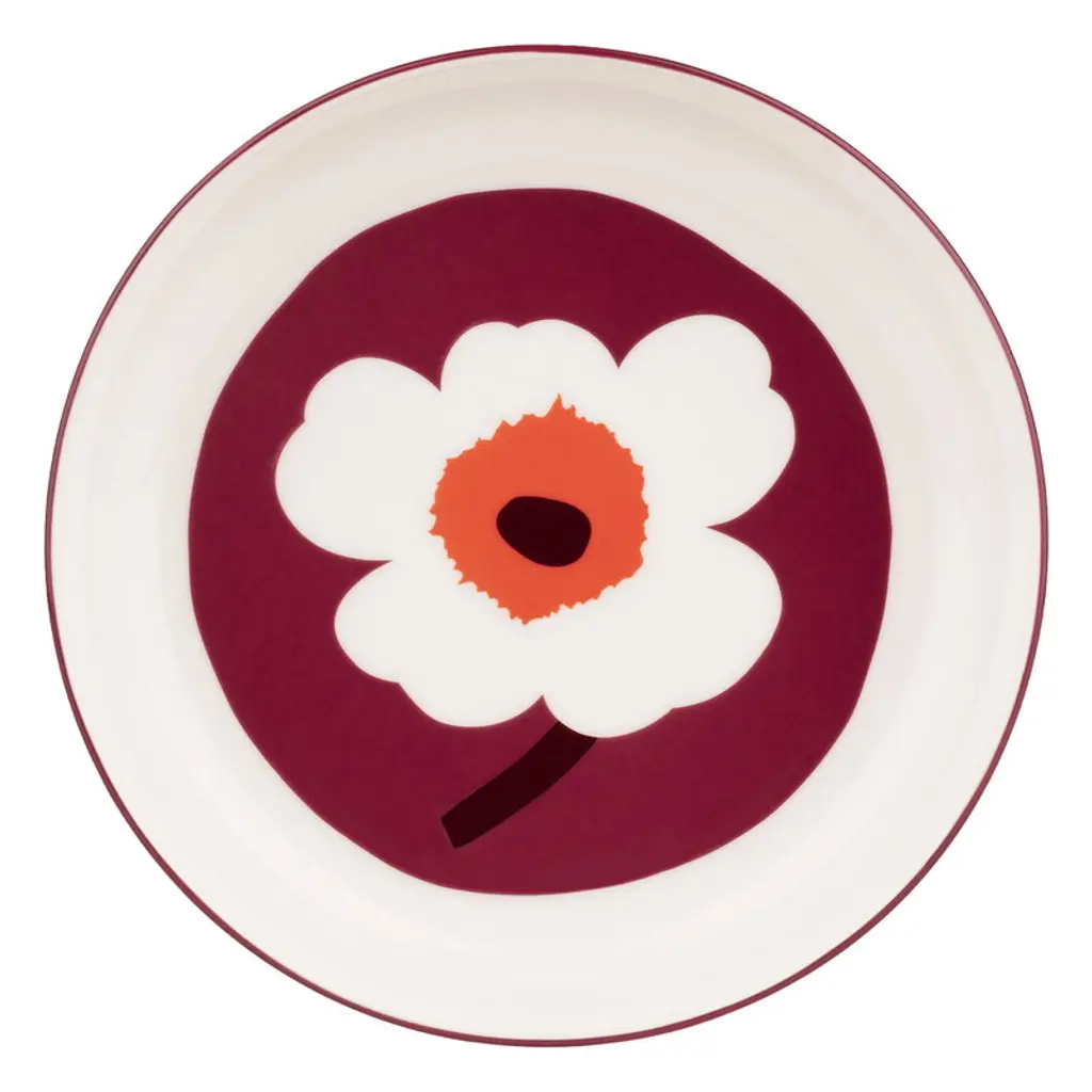 Marimekko's Unikko plate is decorated with Maija Isola's iconic floral pattern. This 20-centimeter size is ideal as a small dinner plate or serving appetizers and sandwiches, for example. The ceramic plate is part of the Oiva tableware range, designed by Sami Ruotsalainen, and is easily combinable with monochrome dishware as well as other Marimekko patterns. Why not collect a whole range of Unikkos in different colors? All fans of Finnish design surely recognize Unikko, but have you ever heard the story behind the pattern? Maija Isola created it in 1964 after Armi Ratia, the founder of Marimekko, had publicly announced that no floral fabrics would be printed at the design house. Isola did not accept these rules and restrictions without a fight and, in protest, ended up designing an entire collection of bold floral patterns. One of these designs was Unikko – which quickly became a favorite of Ratia, too. Today, Unikko is one of Marimekko's best-known and most beloved patterns worldwide.