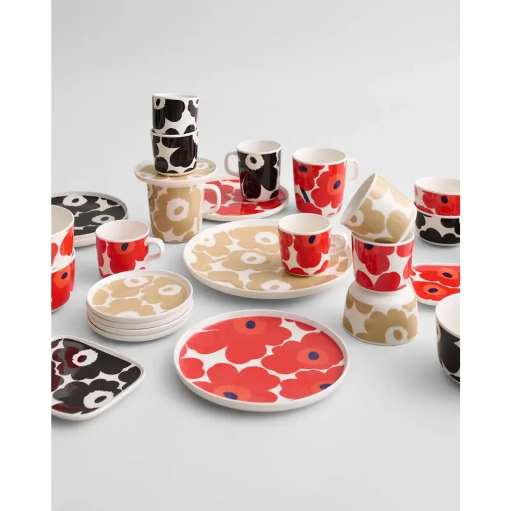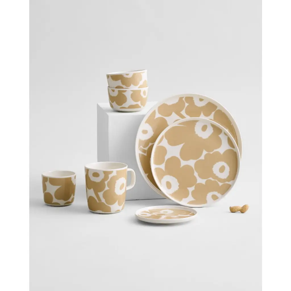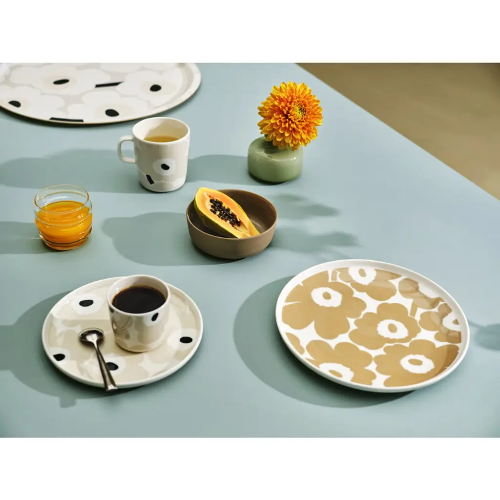 Marimekko’s Unikko plate features Maija Isola’s iconic floral pattern in shades of white and beige. The ceramic plate is part of Sami Ruotsalainen’s clean-lined Oiva tableware collection that suits both casual and festive settings. The Unikko pattern came about in 1964 after Armi Ratia, the founder of Marimekko, had announced in public that no floral fabrics are designed at Marimekko. Maija Isola did not accept rules or restrictions and designed in protest a complete collection of bold floral patterns: Unikko, a Finnish word that means poppy. Today, Unikko is one of Marimekko's best-known patterns and recognized around the world.