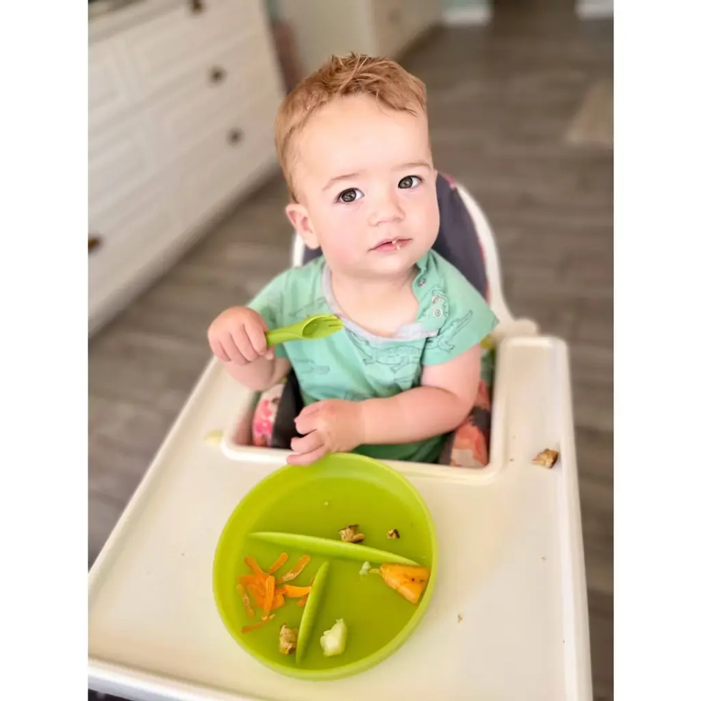 The Olababy 100% silicone divided suction plate is ideal for self-feeding toddlers. It is the perfect plate to train your little ones to eat on their own without worrying about broken plates or messy floors. The patented curved dividing walls eliminate any corners that may harbor food debris for safe and easy cleaning. Its strong suction base sticks to any flat surface and prevents spills to enable a stress-free and no-mess mealtime. The easy release tab allows easy removal by parents. The divided plate is sized perfectly for toddler portions. Its smooth, porous surface is bacteria resistant and very easy to clean